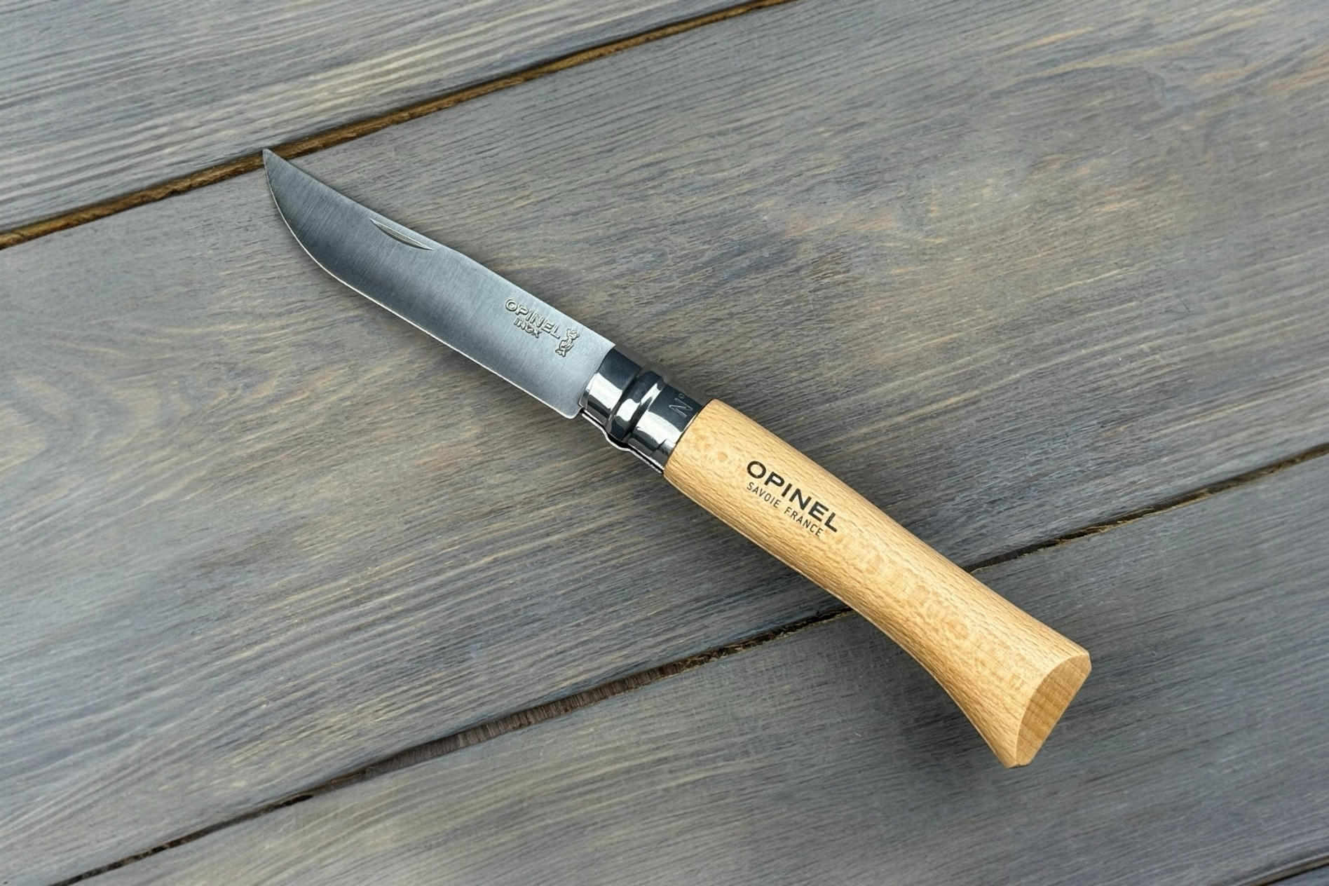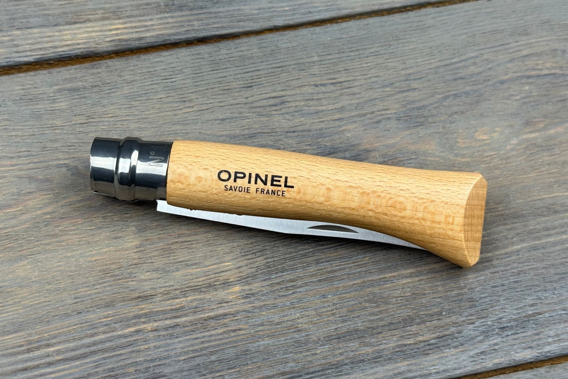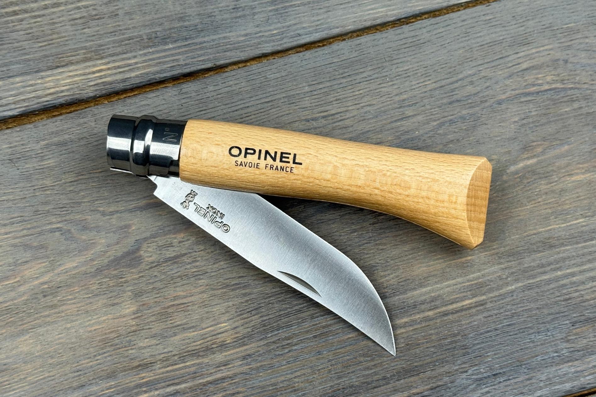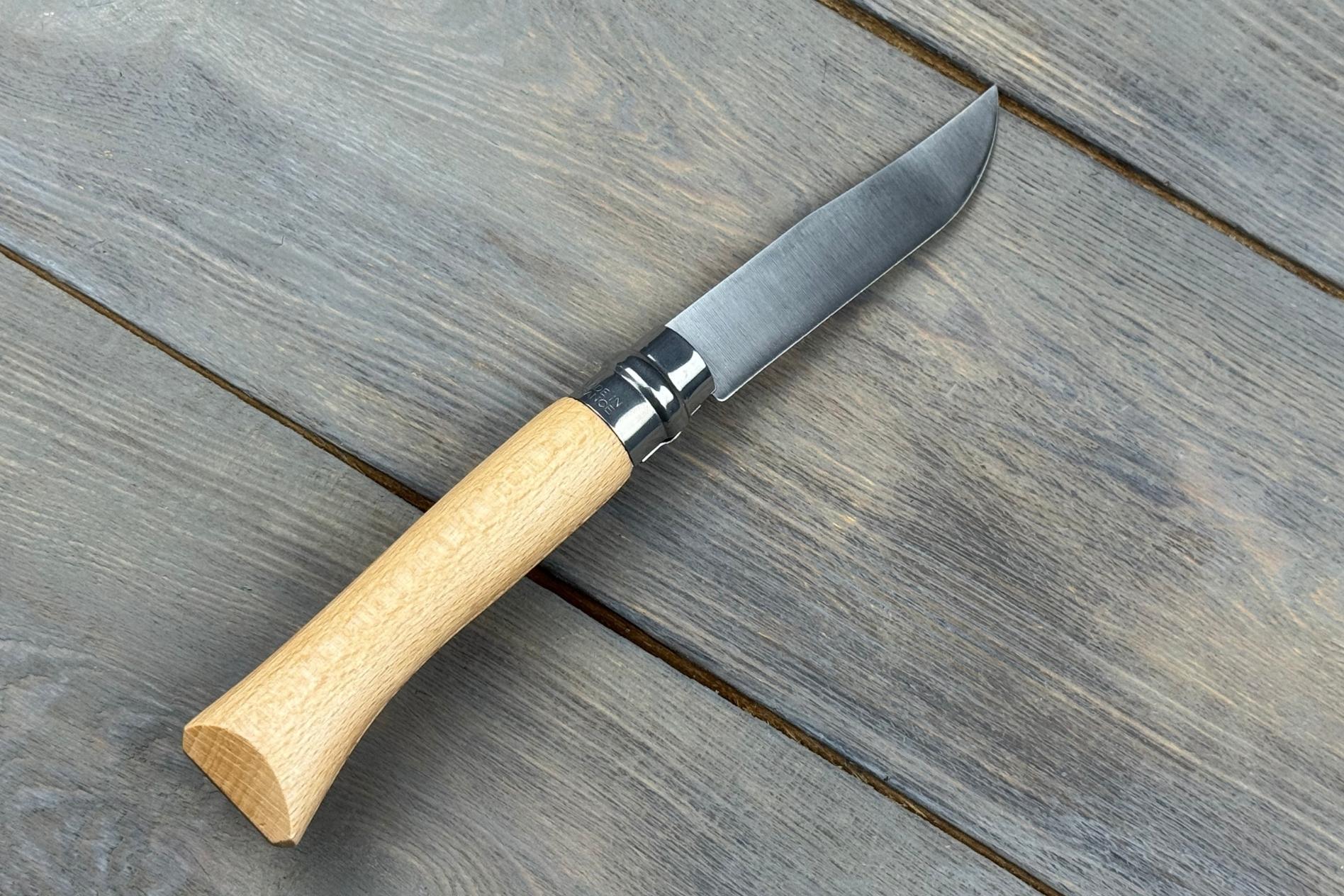 Руків’я зроблене з натурального бука, який із самого початку став візитівкою ножів Opinel. Цей матеріал легкий, теплий на дотик і водночас міцний. Довжина руків’я 110 мм, тому ніж добре лежить у руці, дозволяючи виконувати навіть більш тривалі завдання без дискомфорту. Природна текстура бука робить кожен ніж унікальним, а захисна обробка деревини підвищує її стійкість до вологи. Класична форма руків’я, що впізнається з першого погляду, стала символом бренду й досі залишається актуальною завдяки своїй зручності.