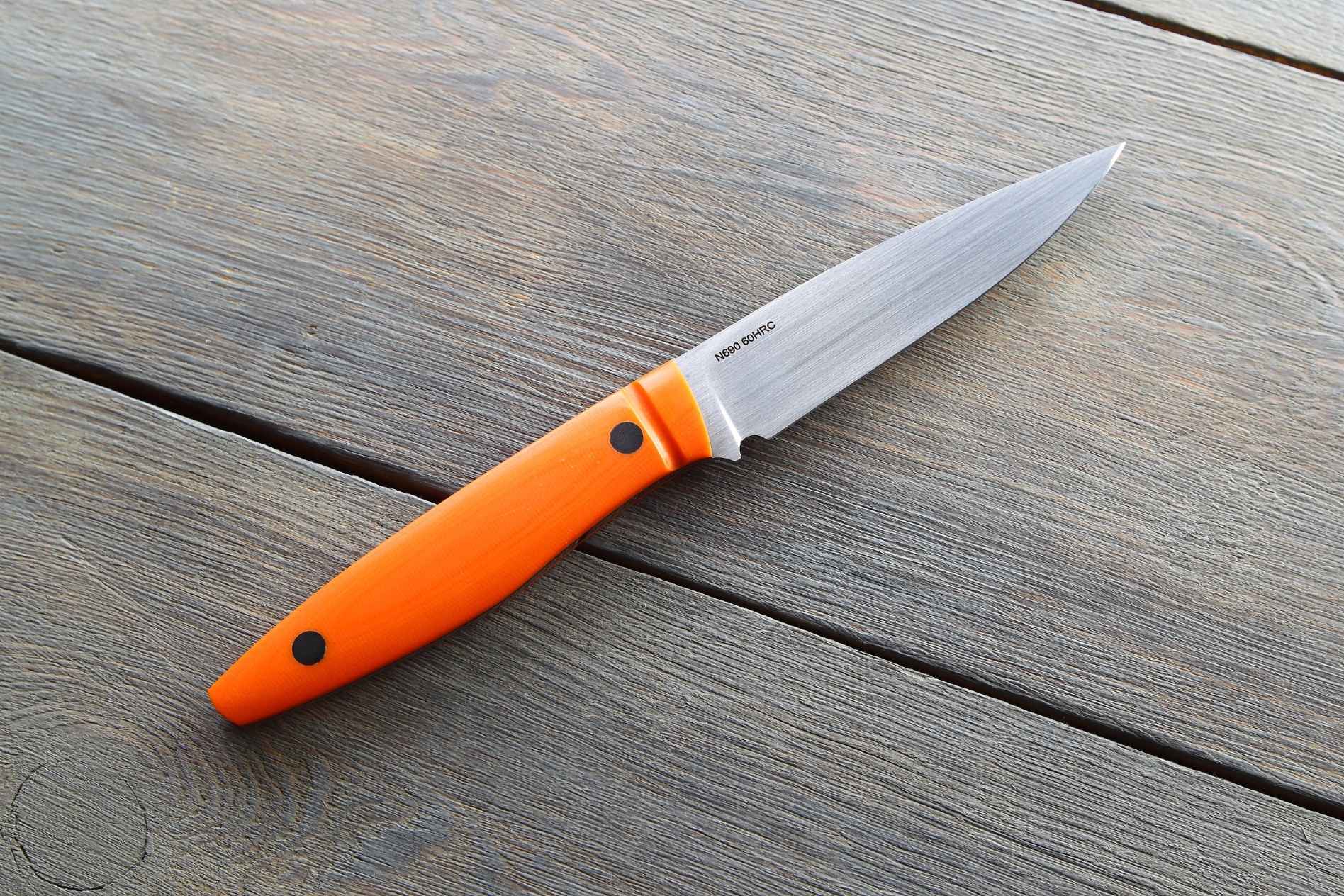 Лезо виготовлене з нержавіючої сталі N690, що гарантує чудову стійкість до корозії та зносостійкість. Товщина леза 2 мм дозволяє використовувати ніж для точної роботи, що робить його ідеальним для обробки продуктів, нарізки або інших дрібних завдань. Твердість сталі 60 HRC дозволяє лезу зберігати свою гостроту навіть після тривалого використання.