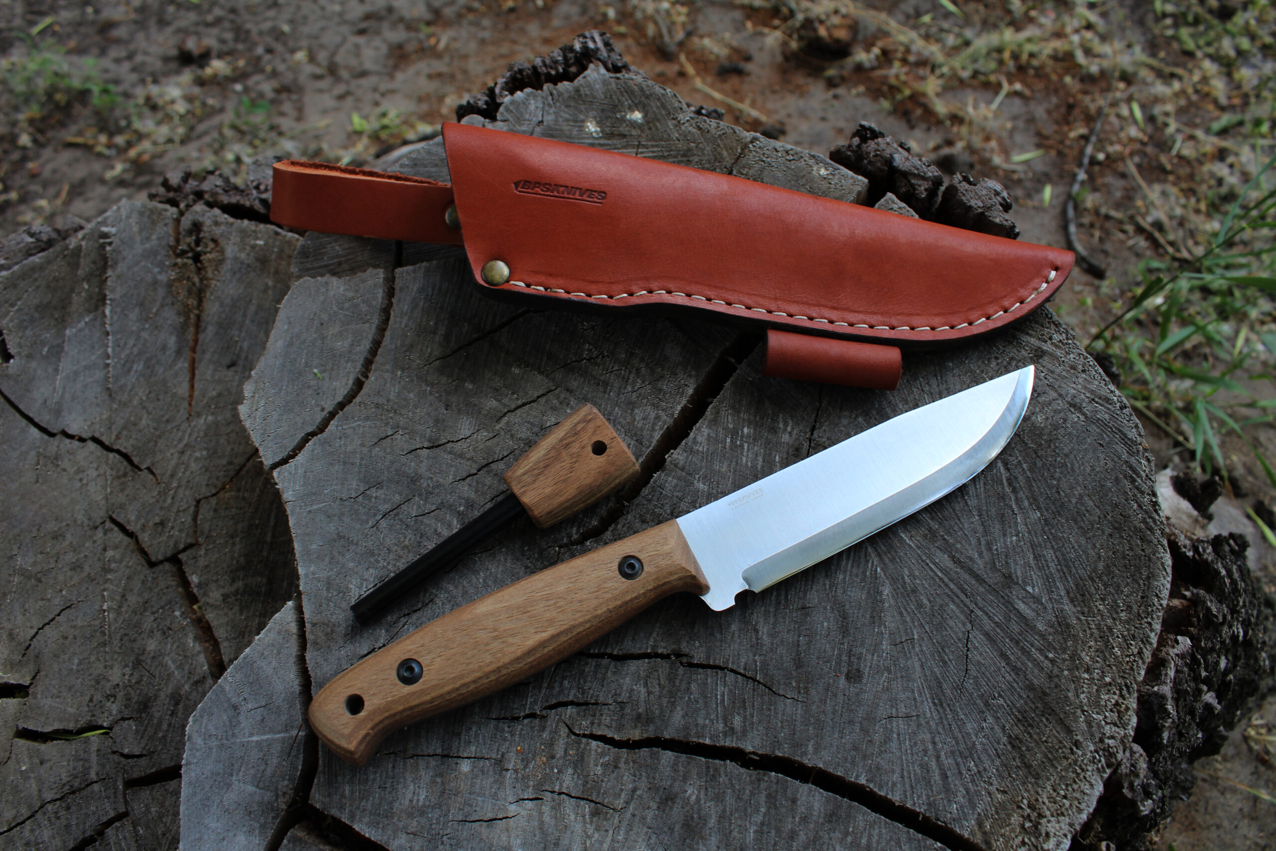 Ручка ножа виконана з деревини горіха, покрита Датським маслом, що дозволяє йому бути стійким до вологи та бруду. Фіксація ручки за допомогою стяжок, її можна легко відкрутити аби почистити ніж.