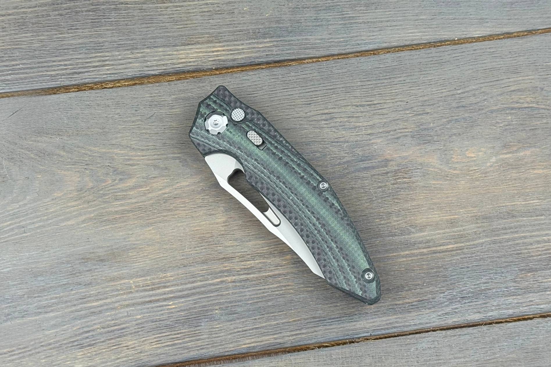 Руків’я виконане з вуглецевого волокна (CF) — матеріалу, що поєднує легкість, жорсткість та естетичну привабливість. Сірий колір надає ножу сучасного, стриманого вигляду. Завдяки довжині 125 мм, ніж зручно лягає у долоню, забезпечуючи надійний хват під час роботи.