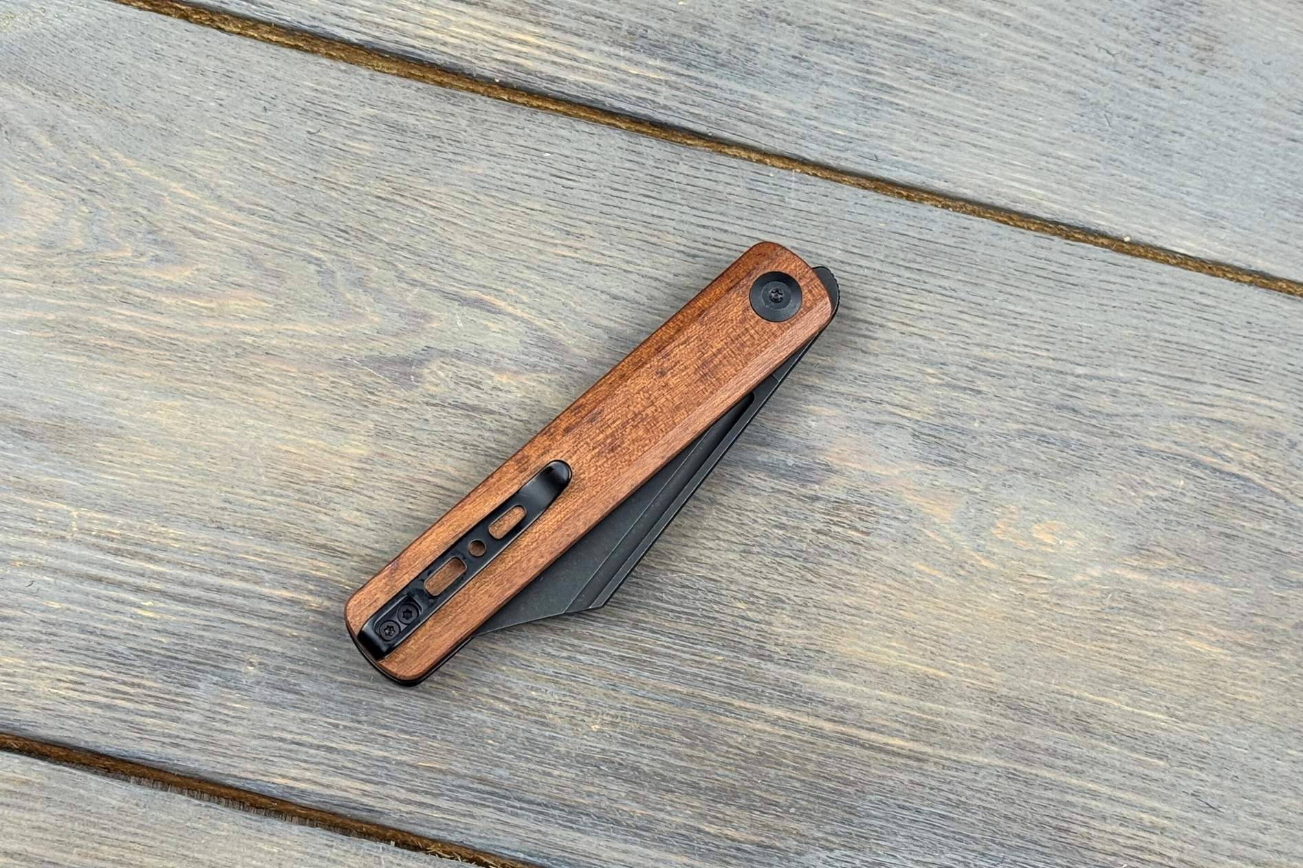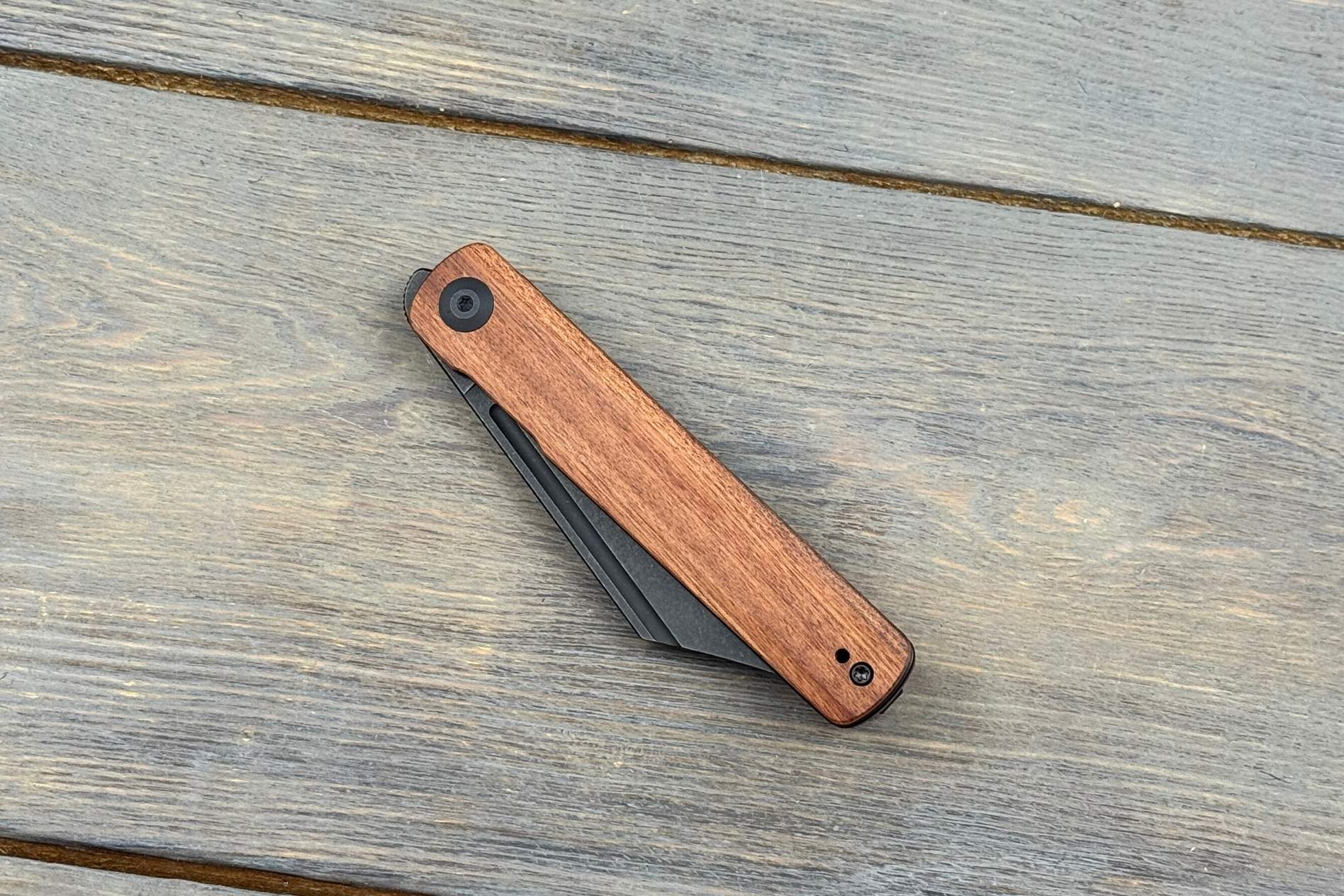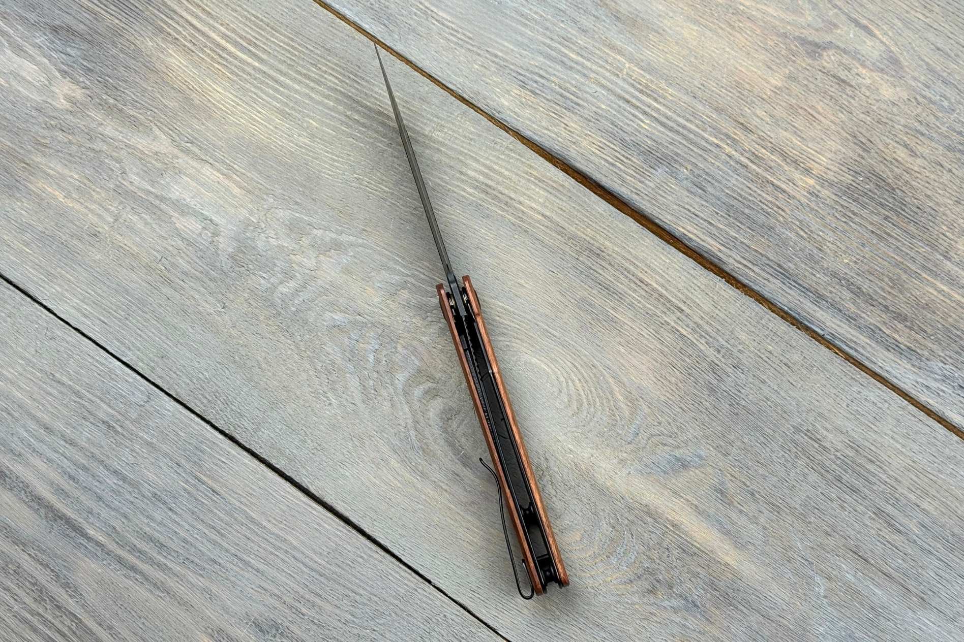 Руків’я довжиною 114,1 мм виготовлене з натуральної деревини Cuibourtia. Це екзотична порода, яка відома своєю щільністю, стійкістю до зношування та красивим природним малюнком. Воно зручно лежить у руці, дозволяючи комфортно працювати тривалий час.