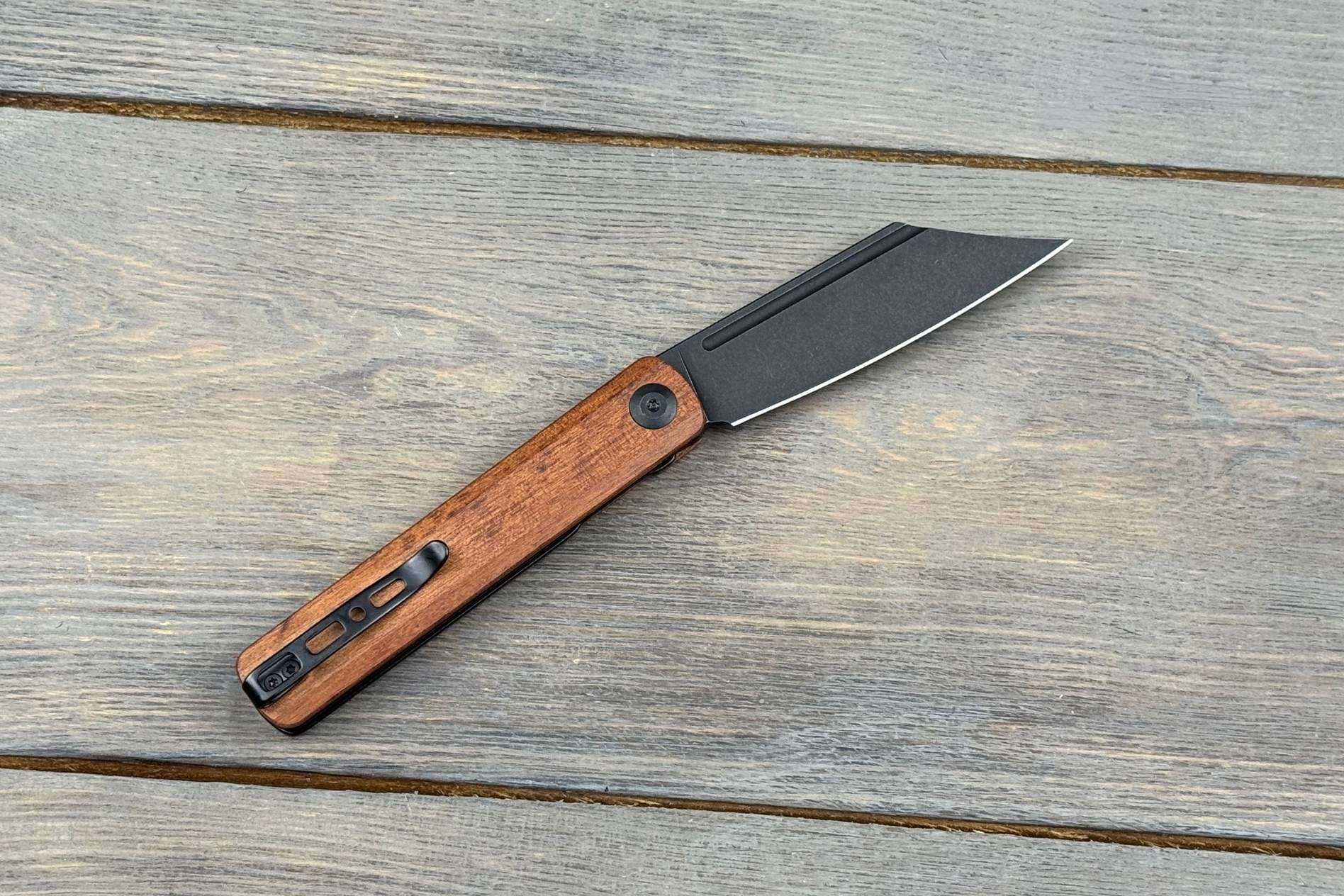 Клинок виготовлений із нержавіючої сталі 9Cr18MoV із твердістю 57–59 HRC. Це сталь, яка добре тримає гостроту, відзначається зносостійкістю та має чудовий баланс між міцністю та простотою у заточуванні. Довжина клинка становить 85,8 мм, товщина — 3 мм. Така геометрія робить ніж універсальним інструментом для щоденних завдань: він легко справляється з різанням паперу, картону, мотузок, деревини чи харчових продуктів.