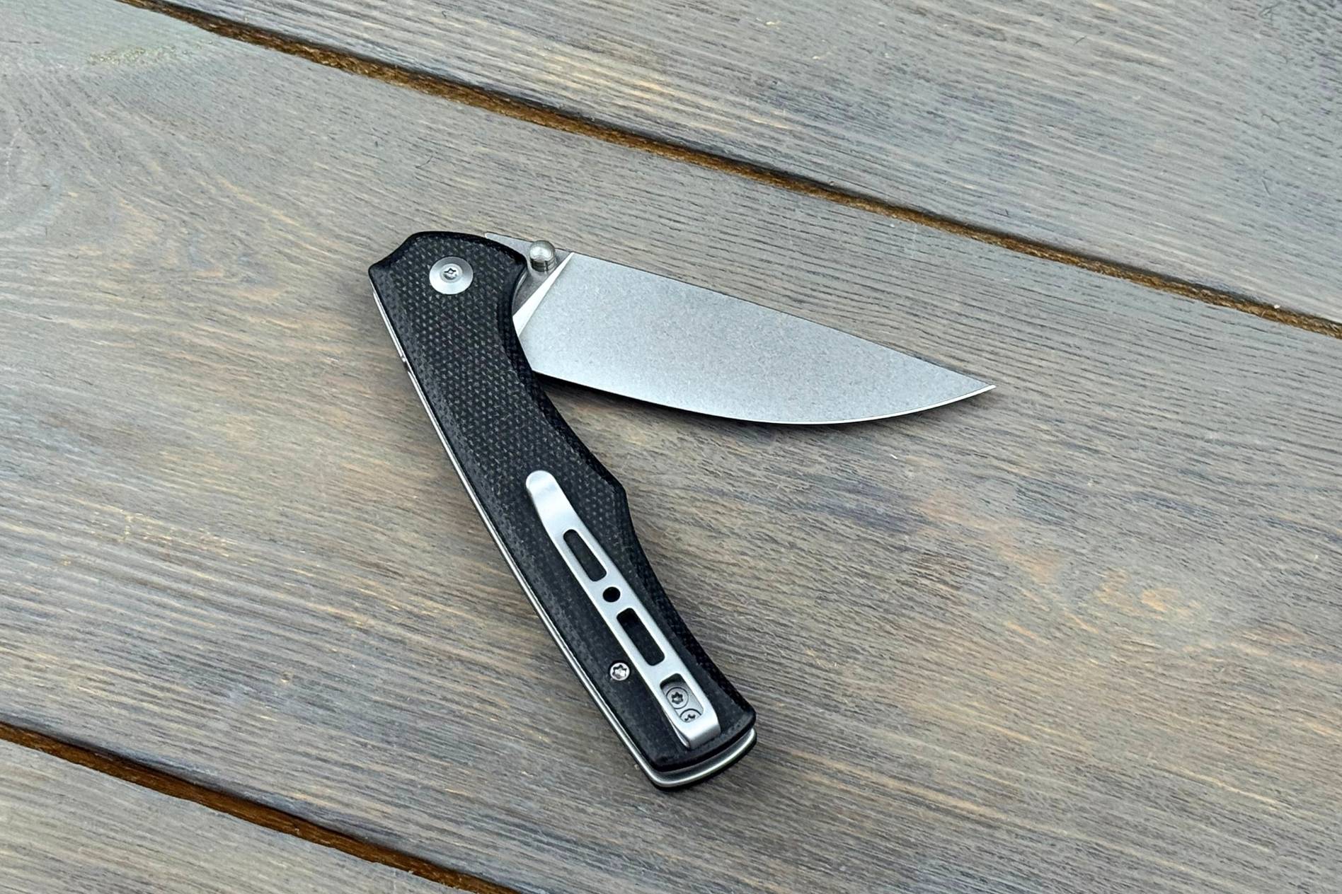 Клинок виготовлений із вуглецевої інструментальної сталі D2, яка цінується за високу зносостійкість, твердість (59–61 HRC) та довге утримання гостроти. Це матеріал, який часто використовують у ножах для інтенсивного використання. Довжина леза становить 88,3 мм, товщина — 3 мм, що робить ніж універсальним: він однаково добре підходить для точних робіт та силового різу.