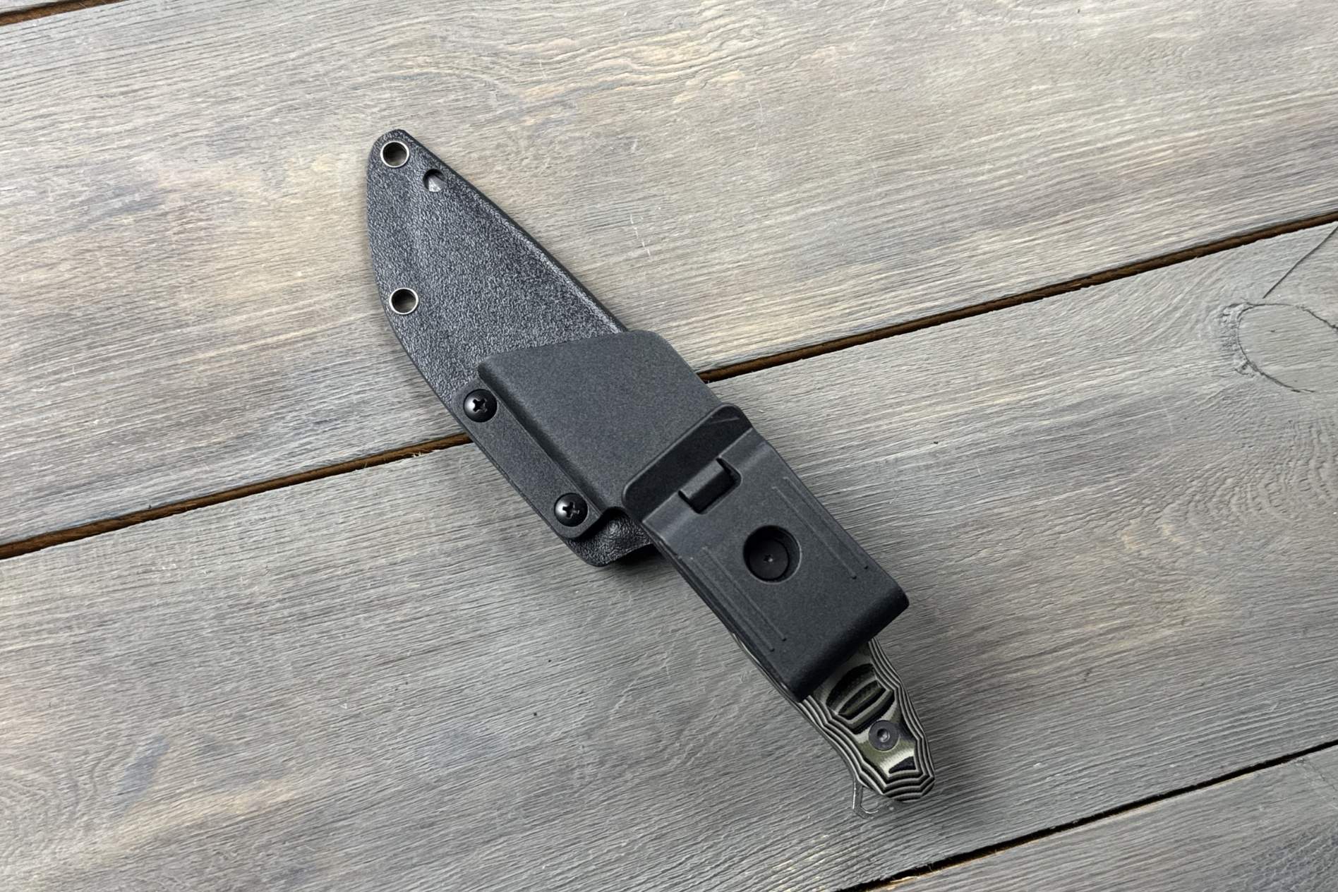 Ніж комплектується ножнами з кайдексу з пластиковою поворотною кліпсою, що дозволяє змінювати спосіб кріплення ножа.