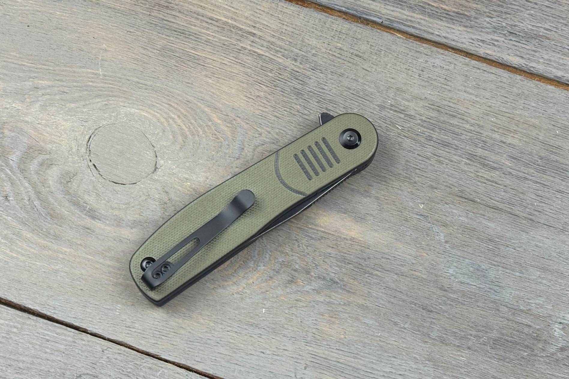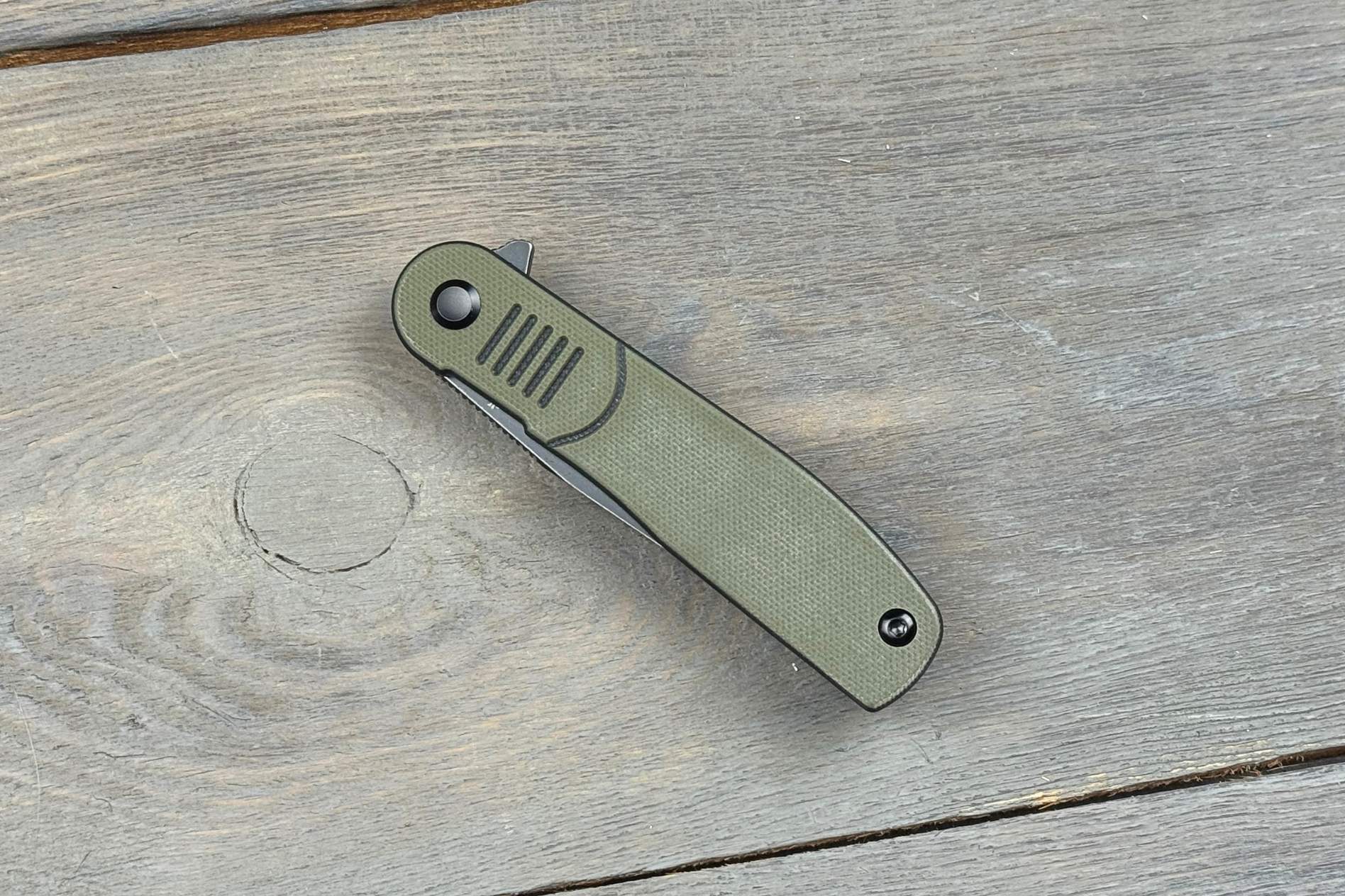 Руків’я довжиною 103,8 мм виготовлене з G10 — міцного та легкого композитного матеріалу, який не боїться впливу вологи та температур. Оливково-чорна палітра створює спокійний, практичний вигляд, а текстура покращує хват у руці. Ергономічні обриси дозволяють тримати цей універсальний складаний ніж комфортно навіть під час тривалої роботи.