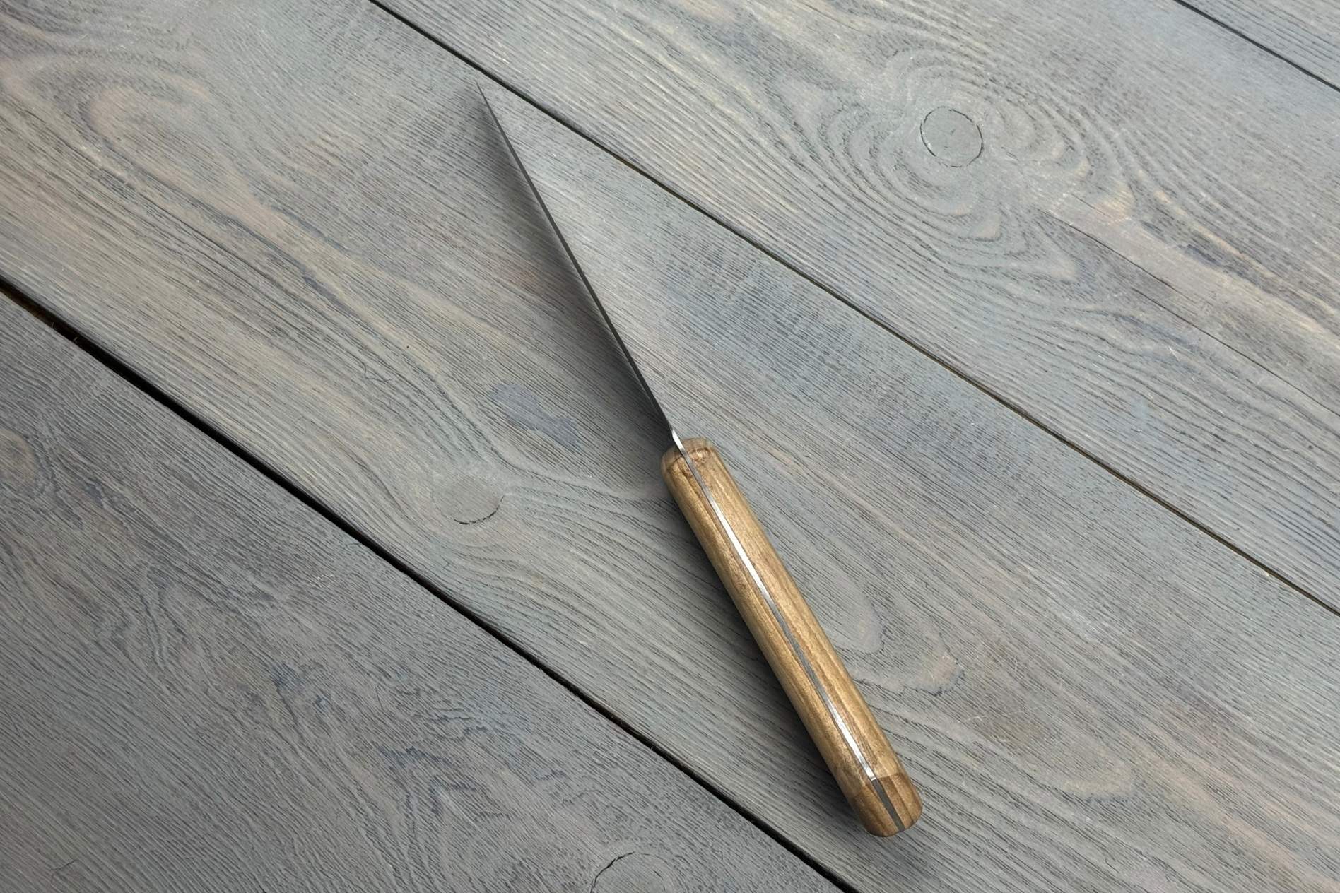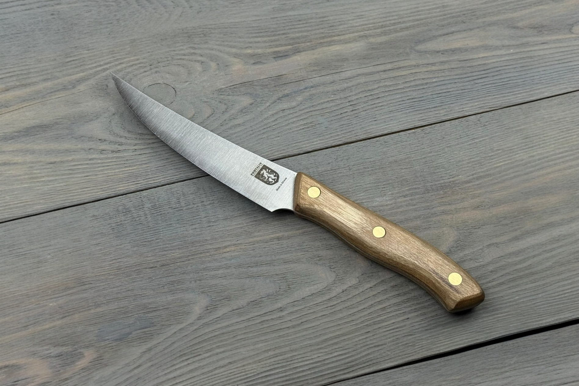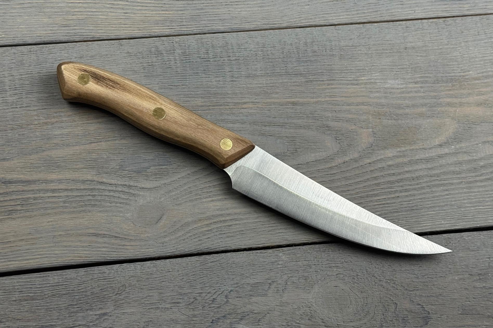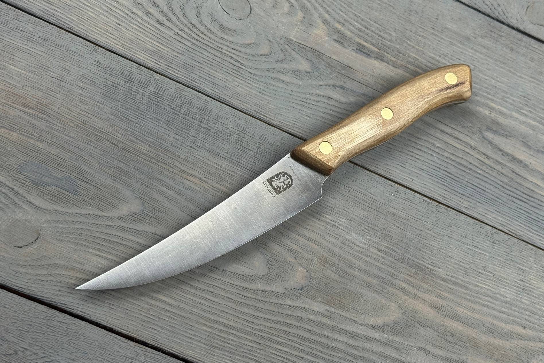 Клинок виготовлений з нержавіючої сталі 50Х14МФ — вона добре чинить опір корозії, легко заточується й зберігає гостроту, якої достатньо для щоденної кухонної роботи.Товщина леза — лише 1,2 мм, а довжина — 140 мм. Завдяки цьому ніж має потрібну гнучкість і легко “ковзає” вздовж кісток або шкіри. Твердість на рівні 57 HRC оптимальна для кухонного ножа: баланс між витривалістю й легкістю у догляді.