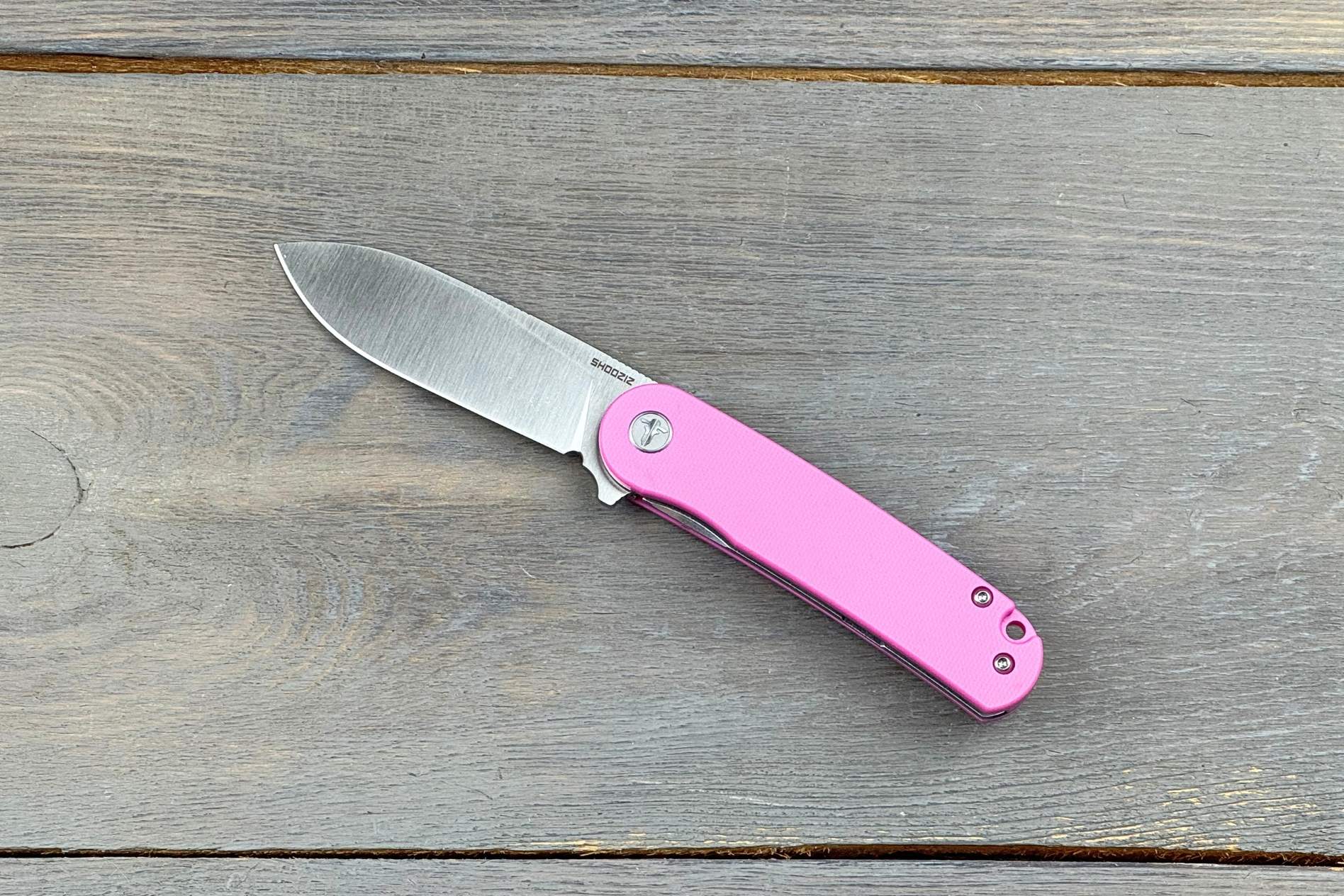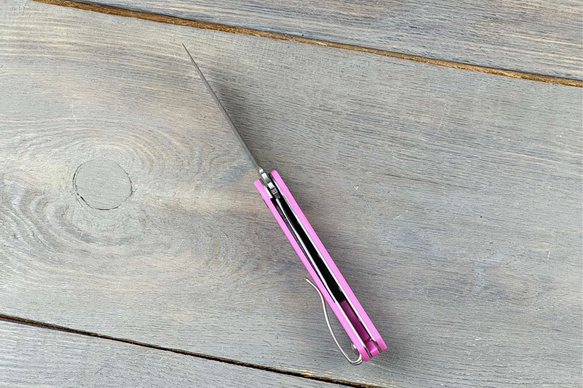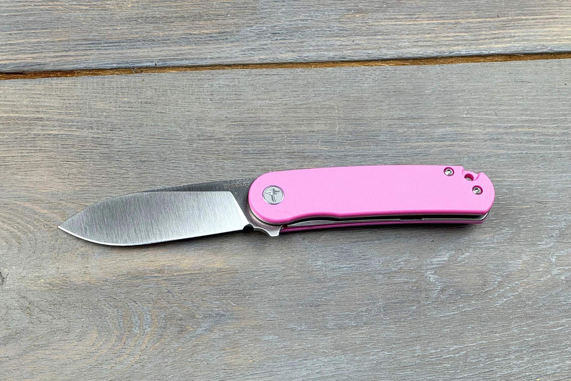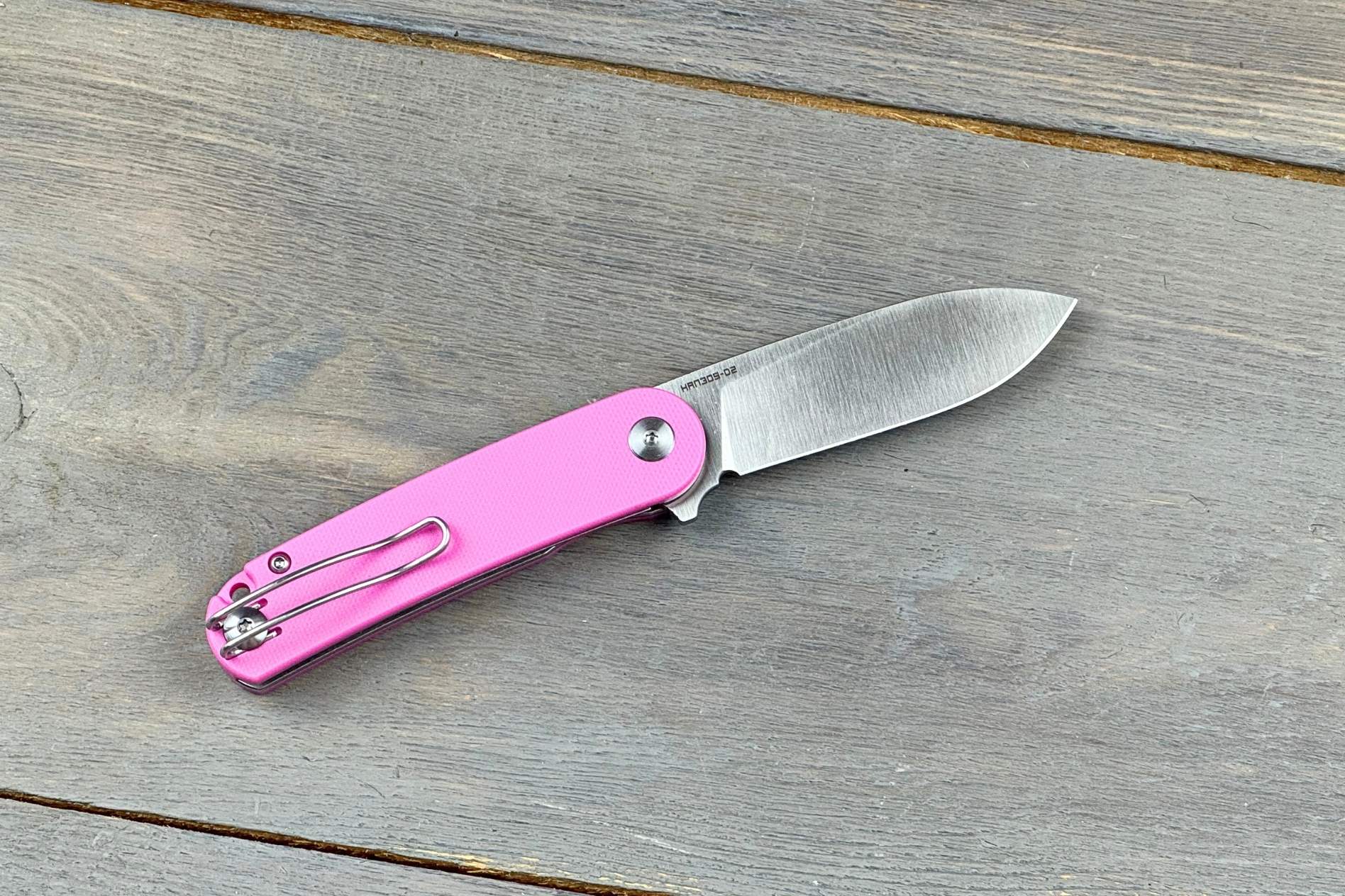 Руків’я виготовлено з рожевого G10 — надміцного, вологостійкого матеріалу з відмінним зчепленням. Завдяки компактним розмірам (91 мм у складеному вигляді) й вазі лише 64 г, цей відкидний ніж зручно лежить у руці та легко поміщається навіть у невелику кишеню. Яскравий колір додає ножу індивідуальності, роблячи його не лише інструментом, а й стильним елементом екіпірування.