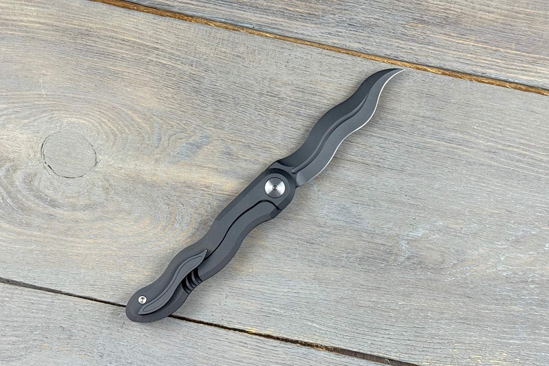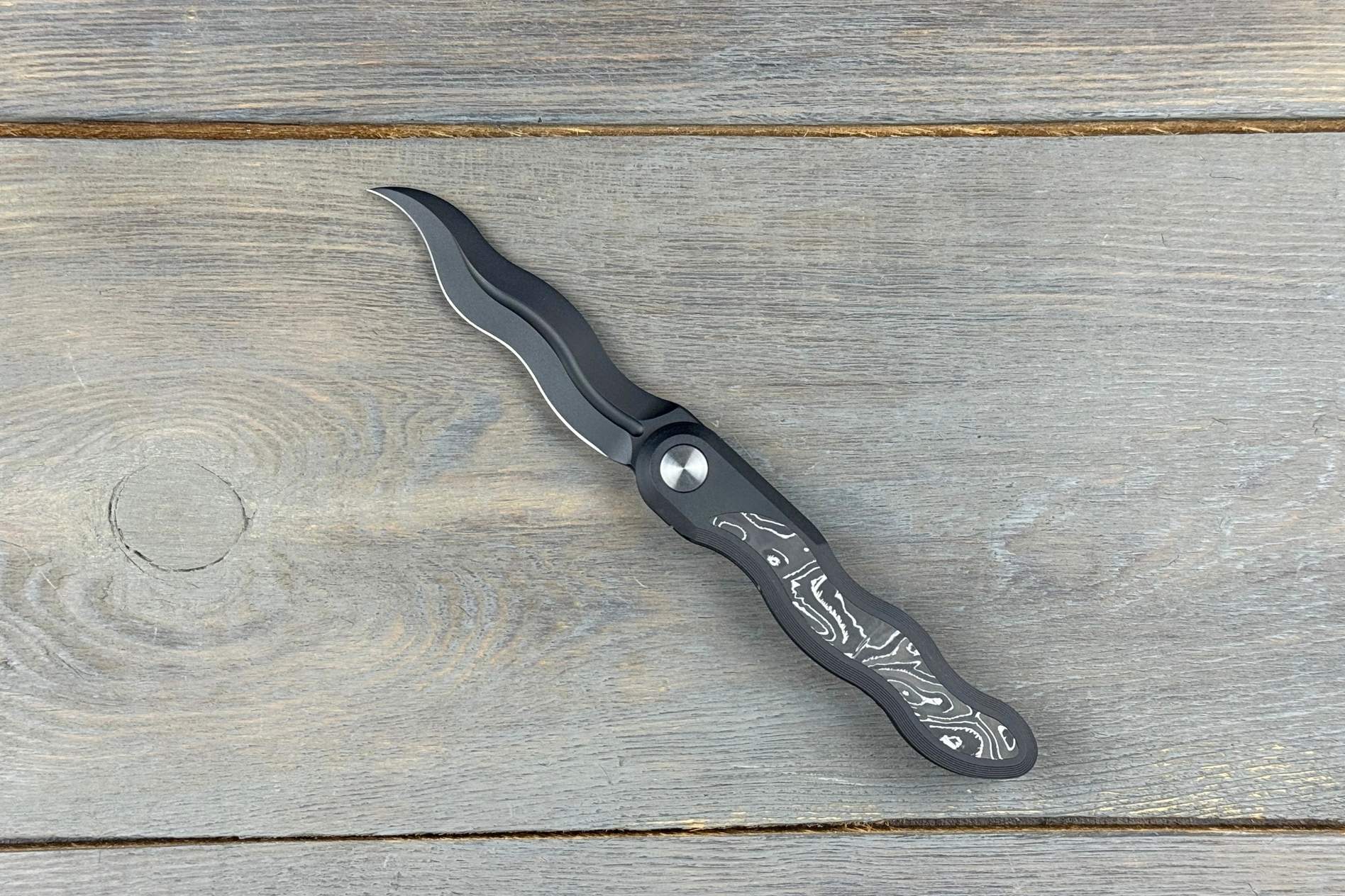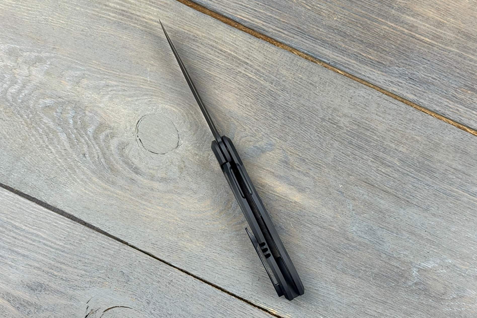 Руків’я довжиною 100 мм виготовлене з титану 6AL4V у поєднанні з пластинами з вуглецевого волокна. Така комбінація забезпечує легкість, міцність та преміальний вигляд. Чорна поверхня підсилює елегантність дизайну, а титанова кліпса гарантує впевнене кріплення ножа під час щоденного носіння.