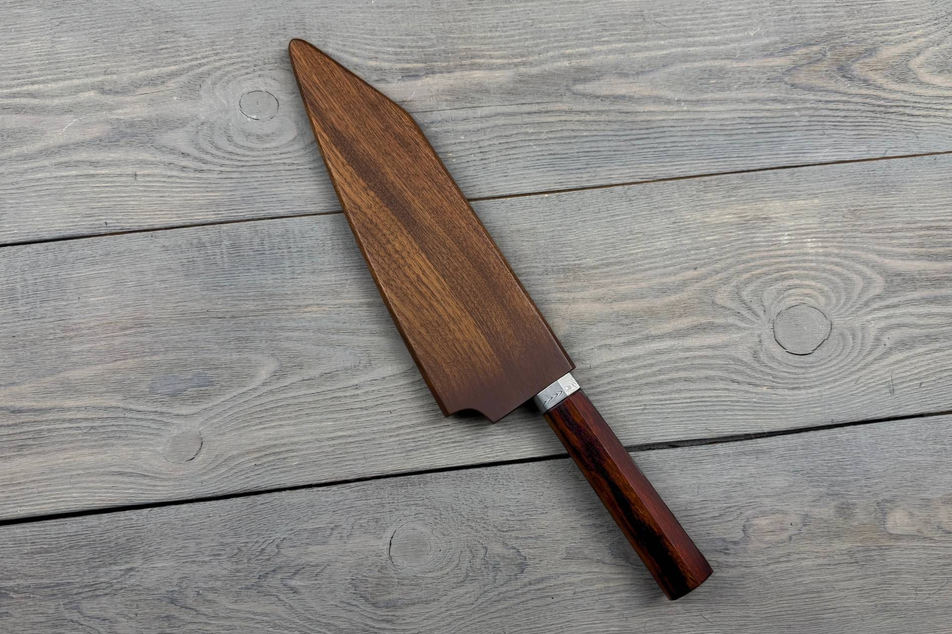 Ніж комплектується ножнами з натурального горіха — дерева, яке відоме своєю міцністю та приємною фактурою. Ножни захищають клинок від механічних пошкоджень. Це зручне й естетичне рішення для зберігання або транспортування ножа.