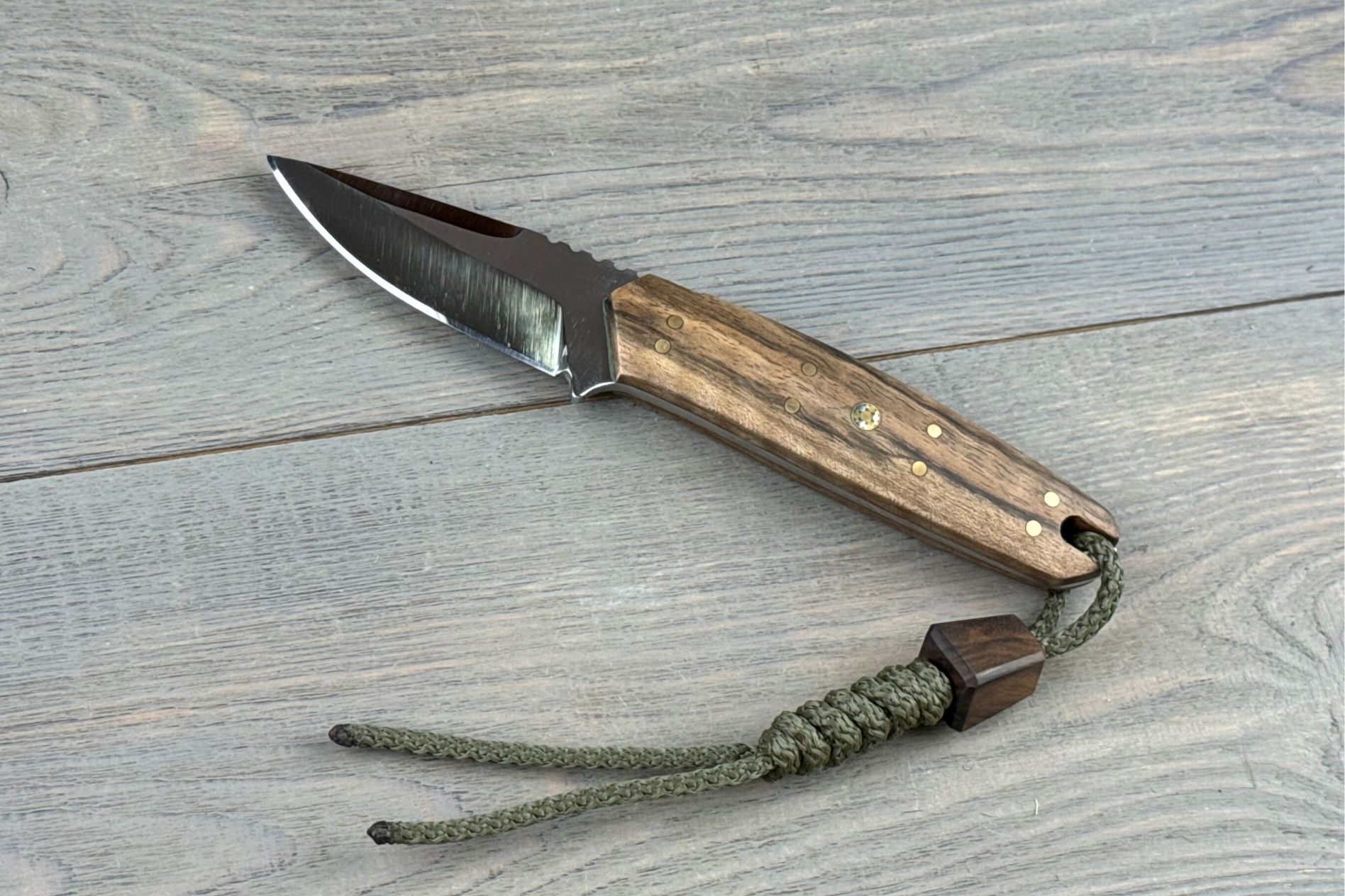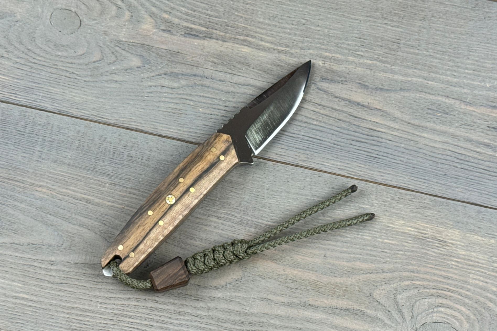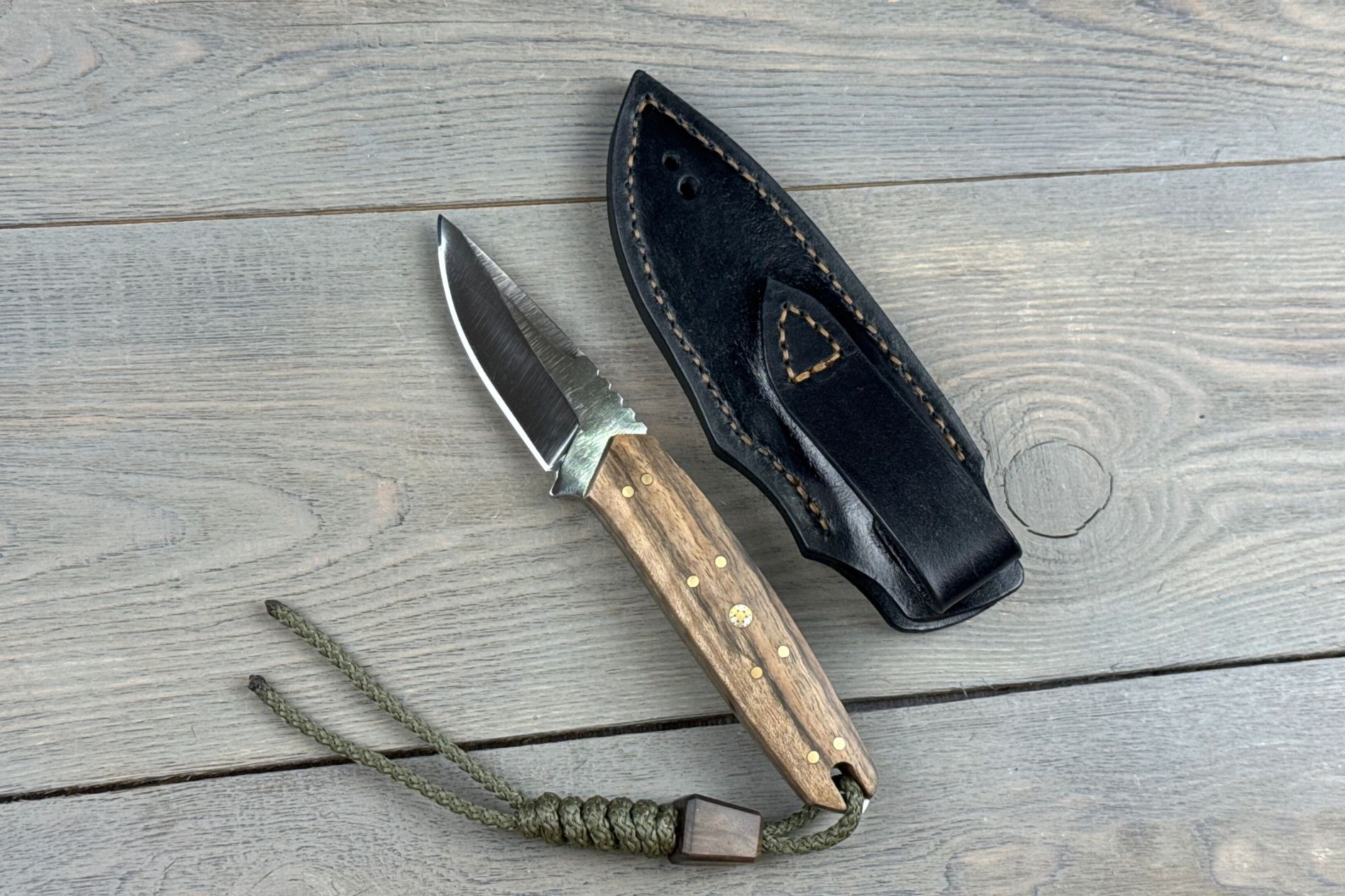 Руків’я виготовлене з горіха — натуральної деревини з приємною текстурою та високою міцністю. Для додаткової надійності та декоративності використано латунні штифти і мозаїчний пін, які одночасно посилюють конструкцію і надають унікального вигляду.