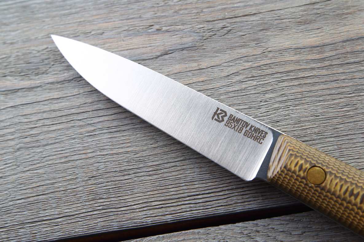 Лезо овочевого ножа Banitov Knives виготовлене з високоякісної нержавіючої сталі 95Х18, що забезпечує його тривалу гостроту та ефективність у роботі.