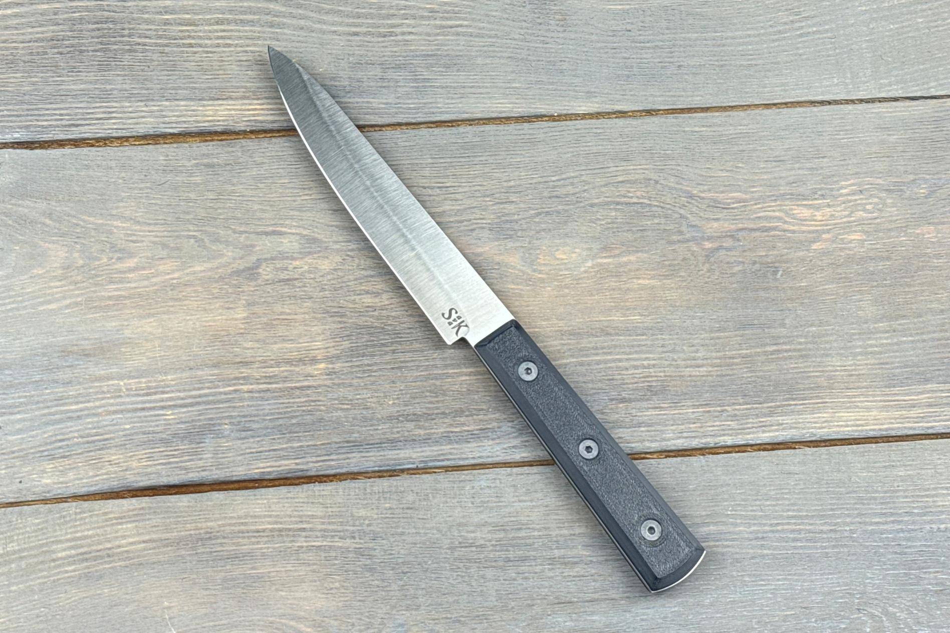 Обробний ніж (SavaKnife) — це універсальний кухонний інструмент, створений для роботи з м’ясом, рибою та великими продуктами. Завдяки довгому клинку (170 мм) і продуманій геометрії, ніж дозволяє виконувати акуратні зрізи, обробляти великі шматки м’яса, птиці чи риби, а також працювати з овочами та зеленню.