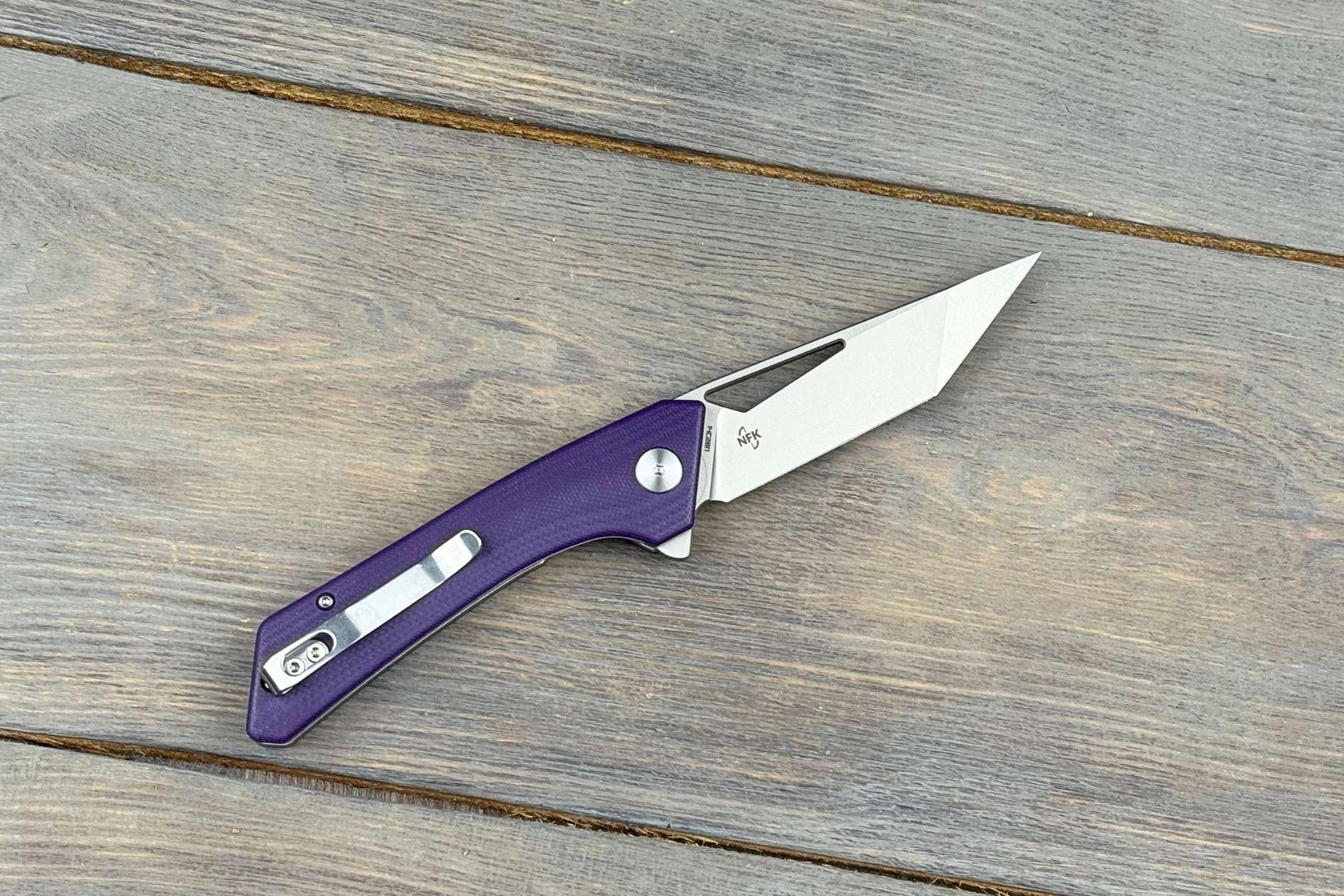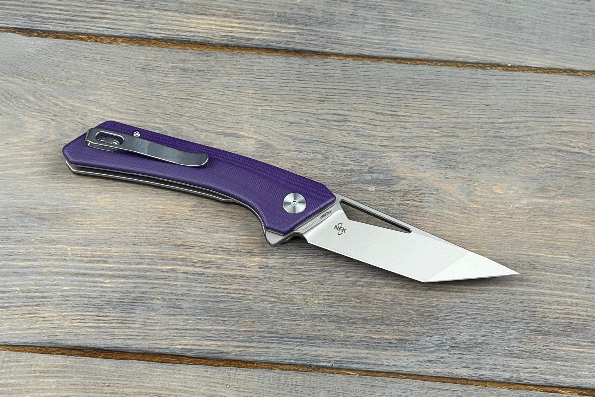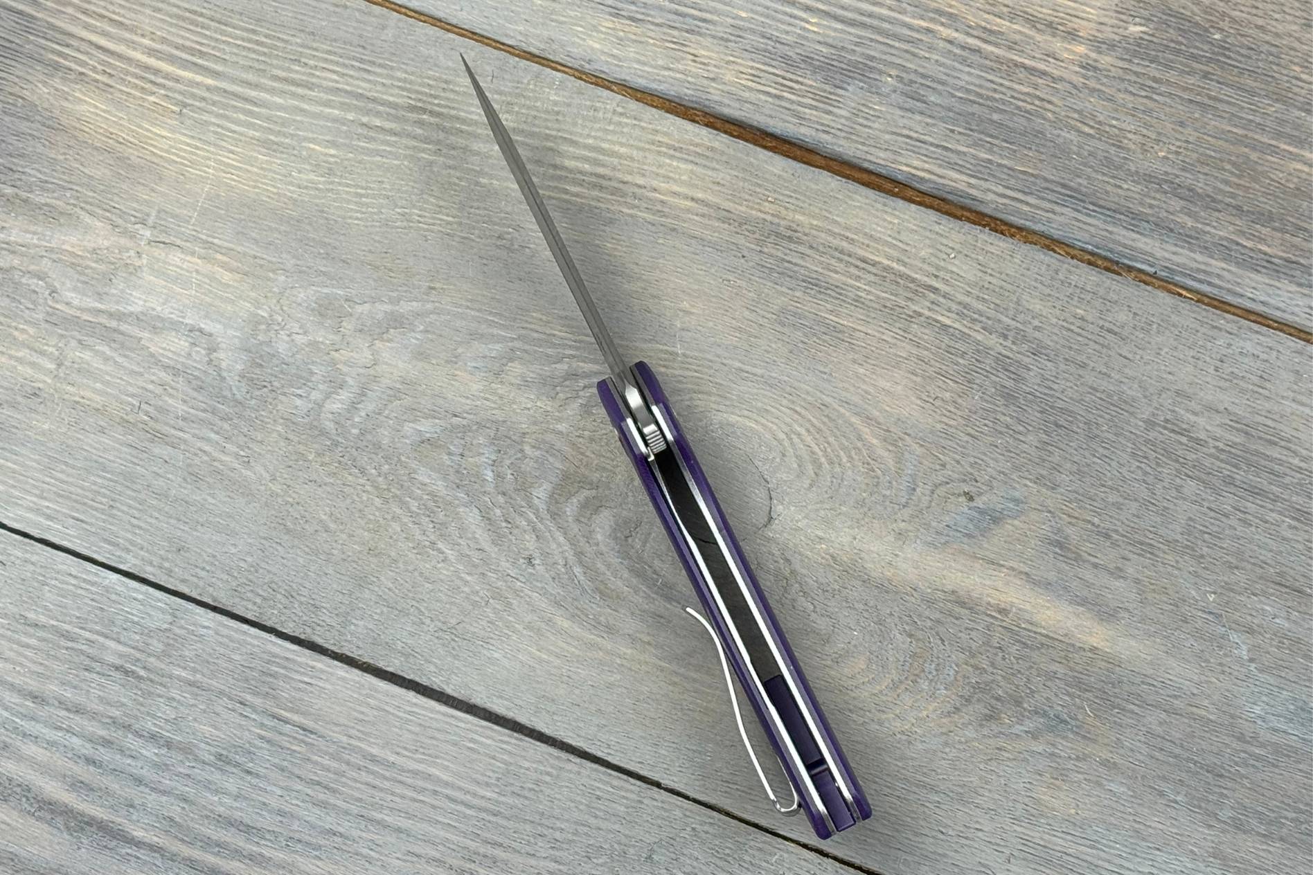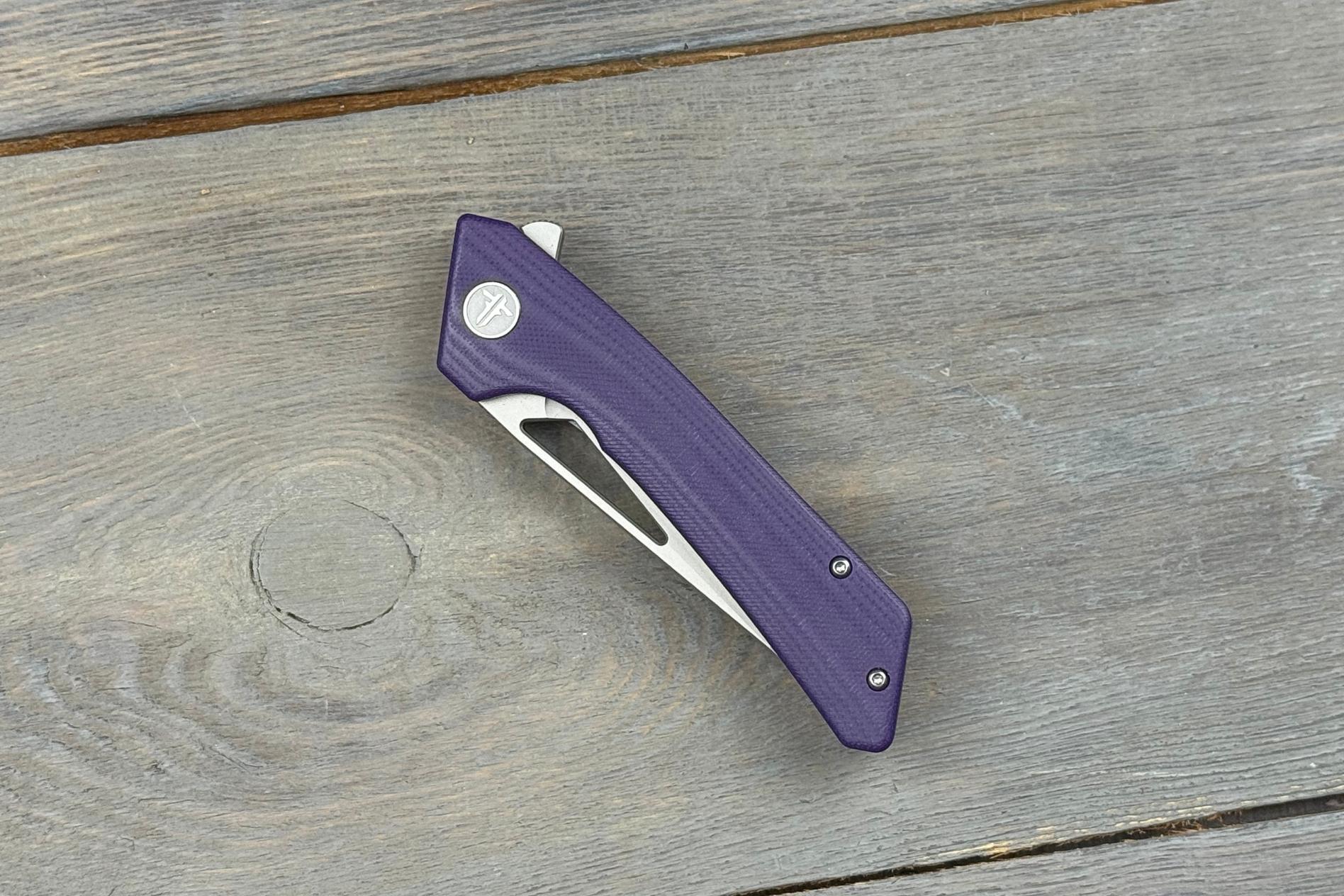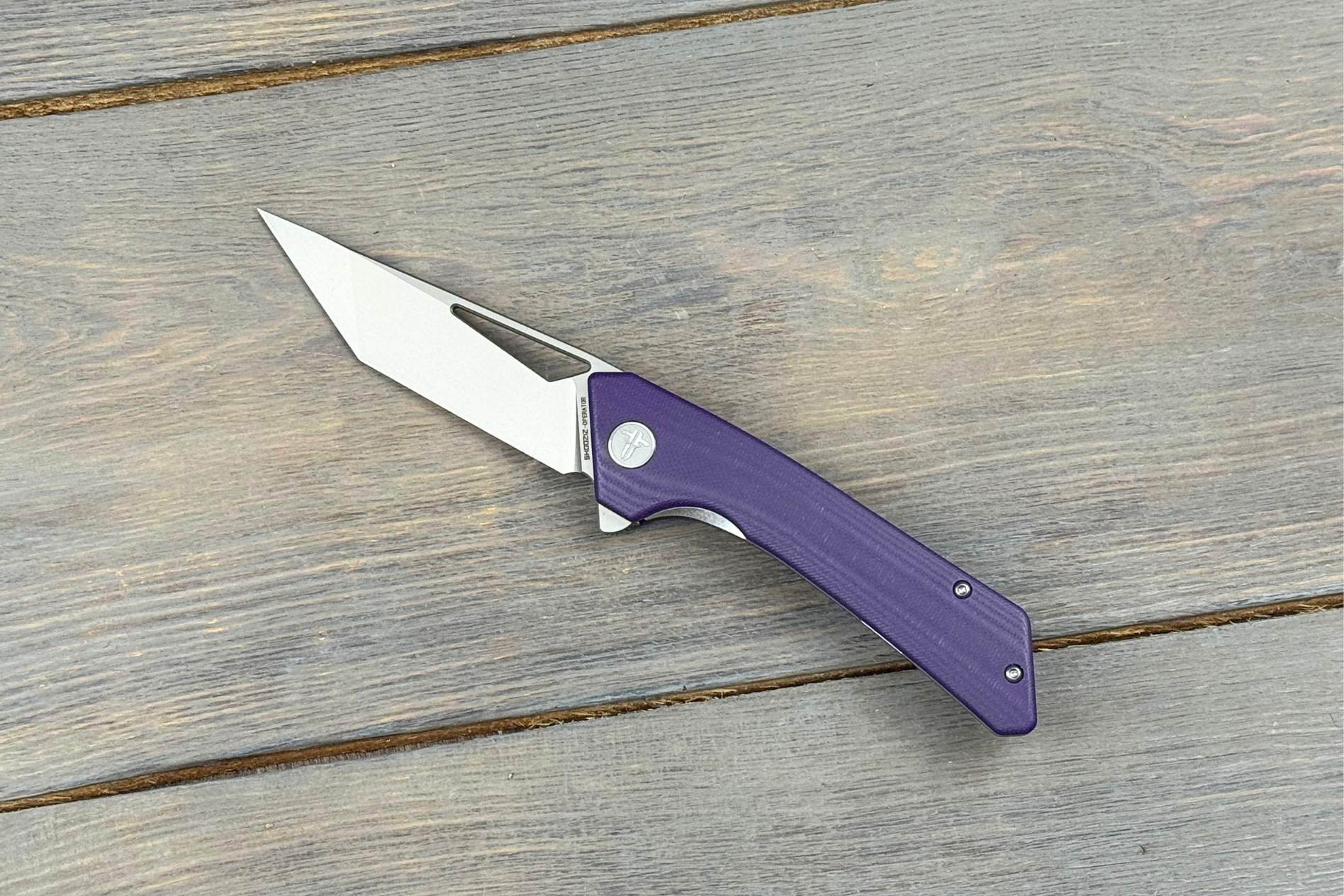 Руків’я виготовлене з Purple G10 — композитного матеріалу, який вирізняється винятковою міцністю, стійкістю до зношування, вологи та температурних коливань. Текстурована поверхня забезпечує надійний хват, а фіолетовий колір додає ножу яскравої індивідуальності. Ергономічна форма дозволяє комфортно використовувати ніж навіть протягом тривалого часу.