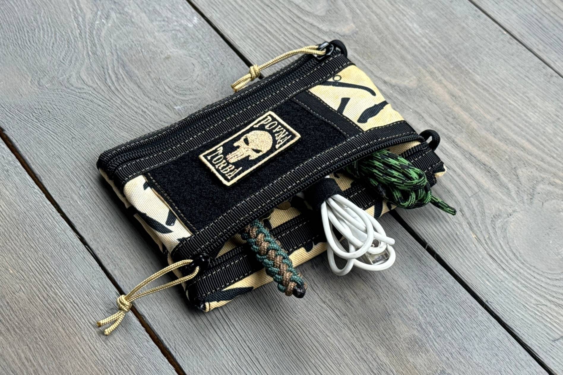 У комплекті — паракорд і стоппер, які дають можливість носити органайзер на шиї або кріпити до зовнішнього спорядження, як-от рюкзак, жилет або сумка.