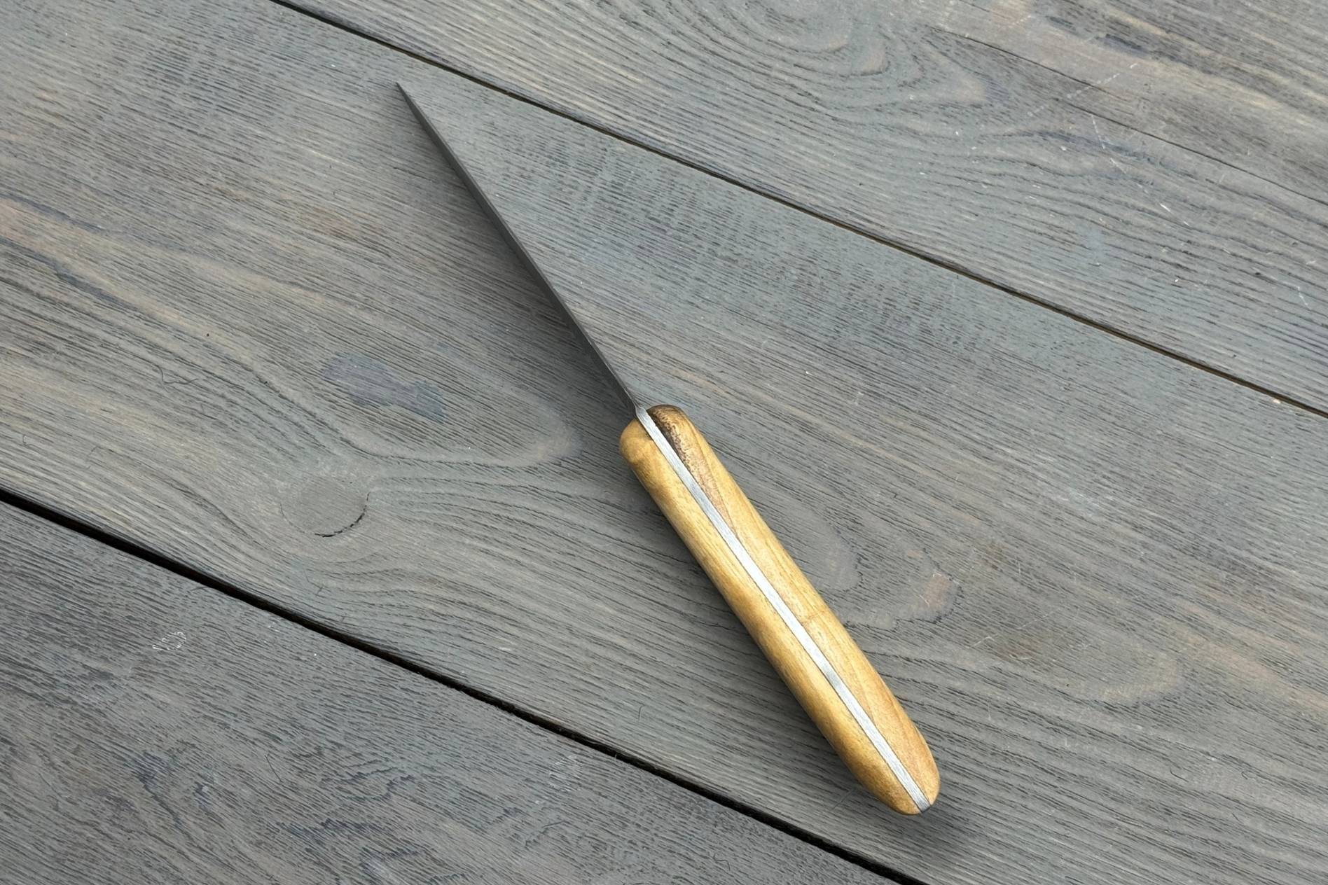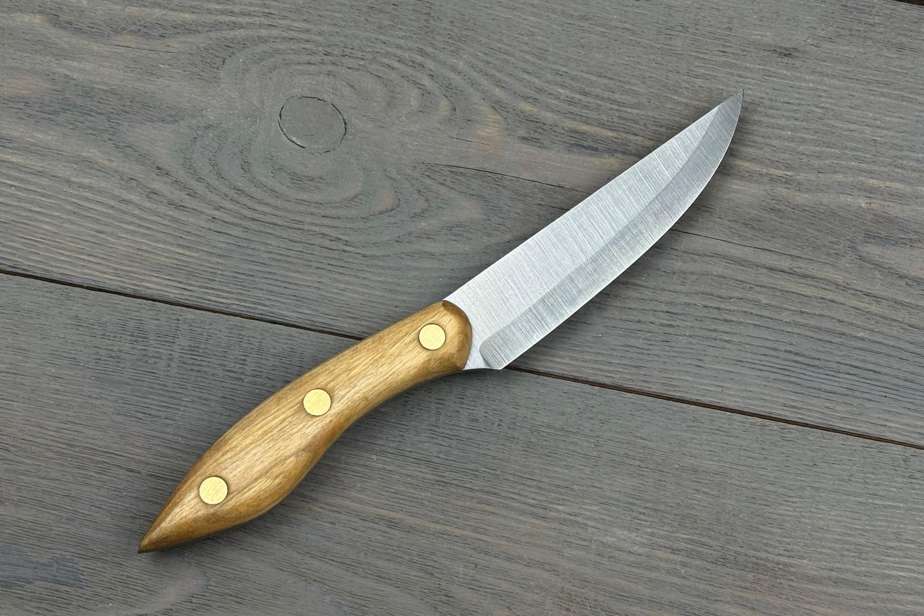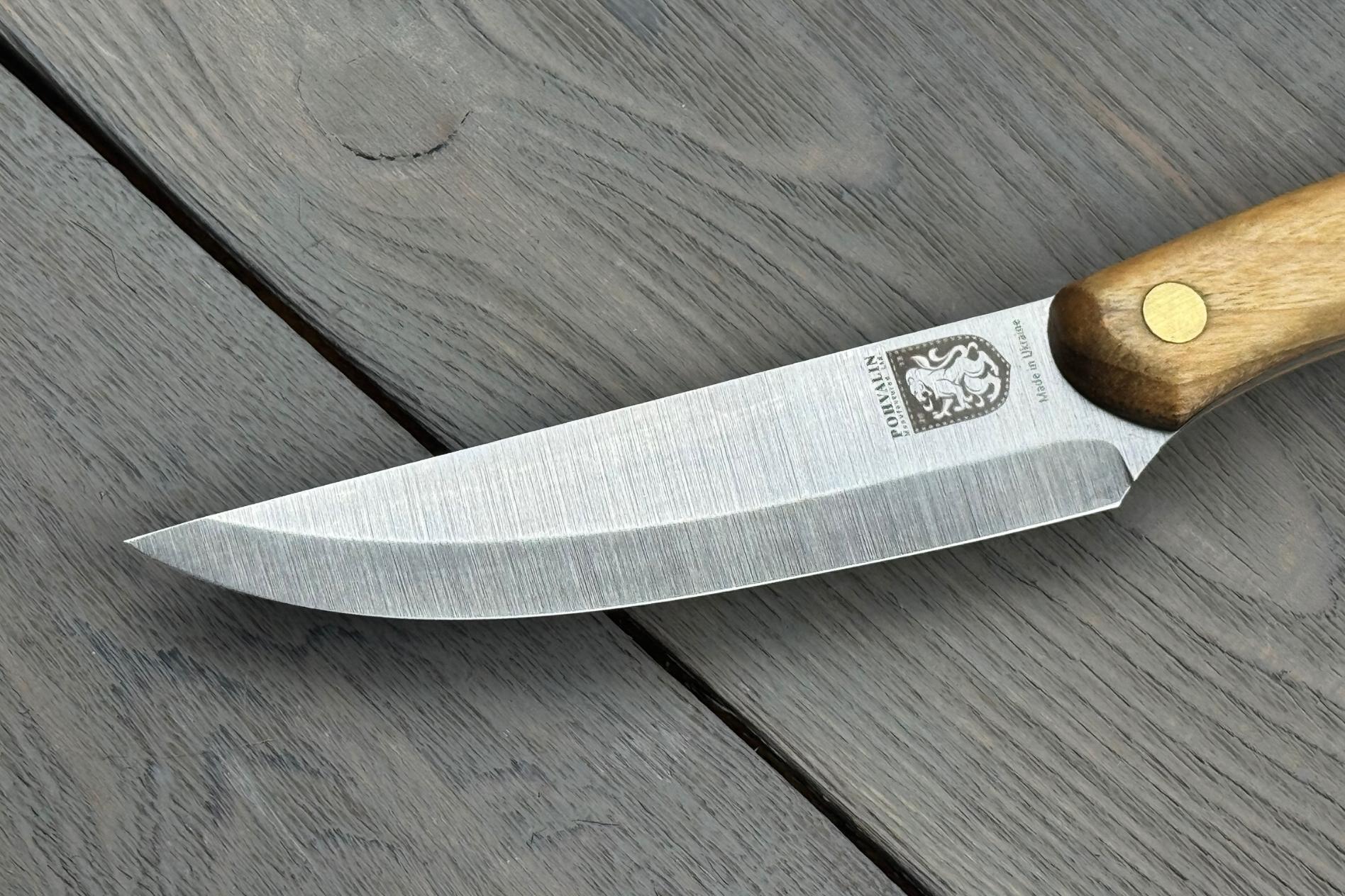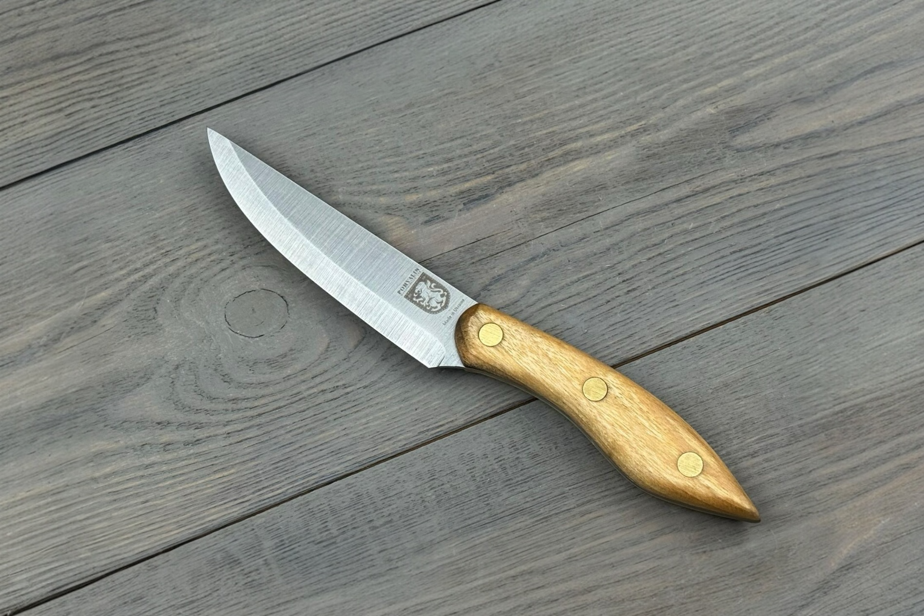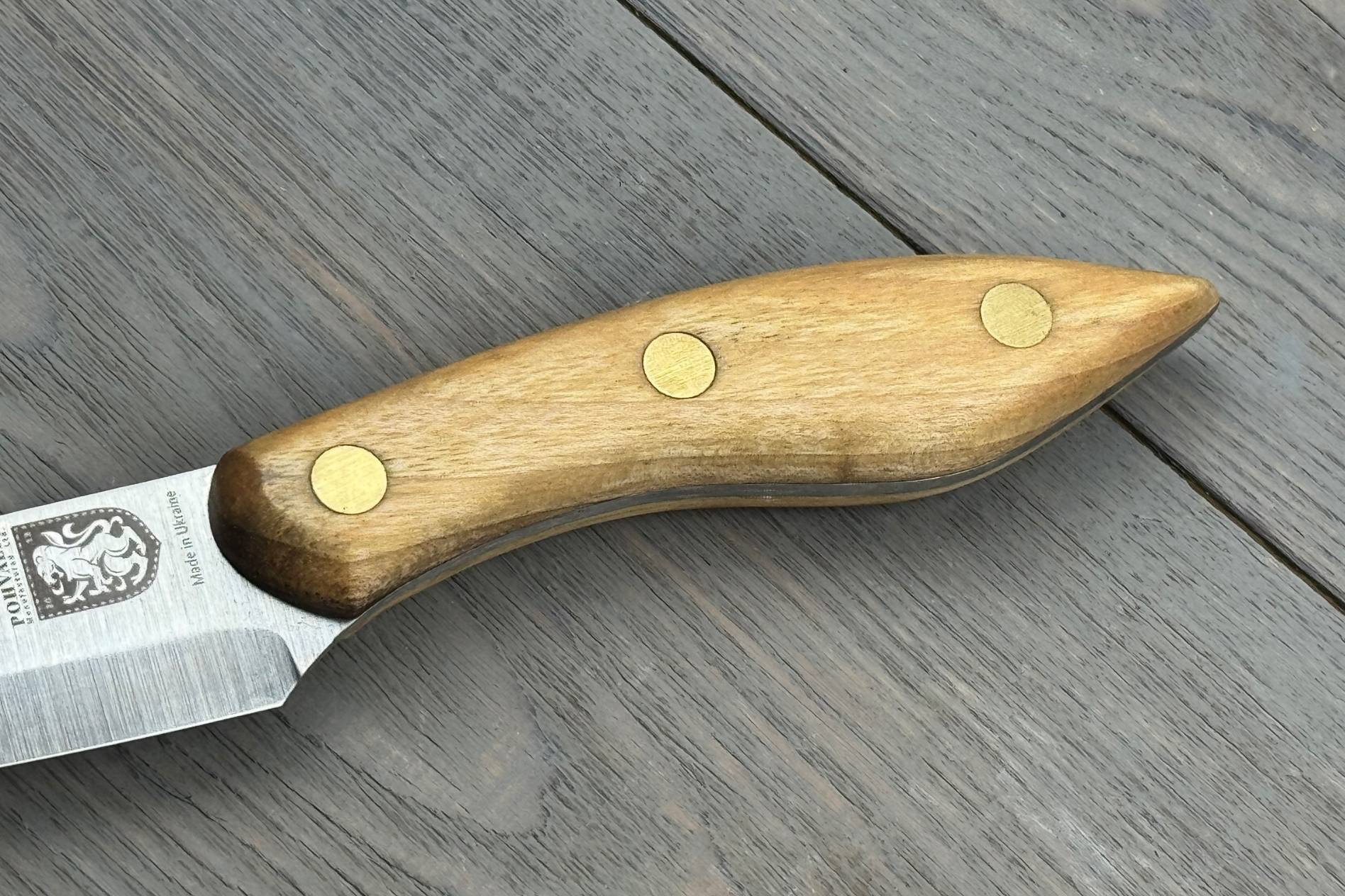 Клинок ножа виготовлено з нержавіючої сталі 50Х14МФ, яка добре зарекомендувала себе в кухонному середовищі. Вона не боїться вологи, не піддається корозії, легко очищається і не вимагає складного догляду. При цьому її твердість на рівні 57 HRC забезпечує стійкість ріжучої крайки навіть при активному щоденному використанні. Довжина леза — 112 мм, а товщина — 2,2 мм. Це оптимальні параметри для тонкої, точної роботи. Лезо дозволяє без зусиль очищати овочі, вирізати серцевини, нарізати зелень, дрібні фрукти або робити філігранну нарізку продуктів для прикрашання страв.