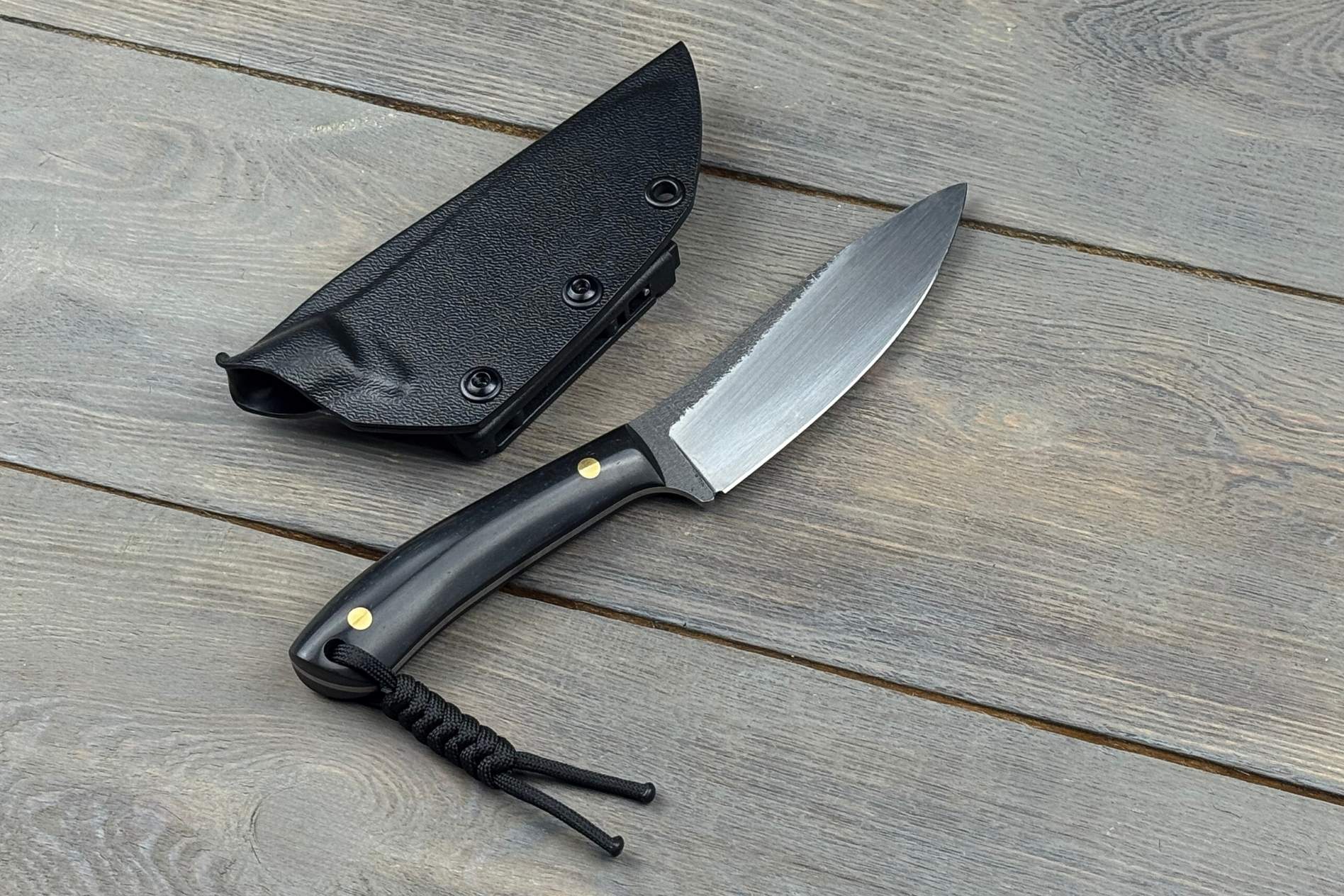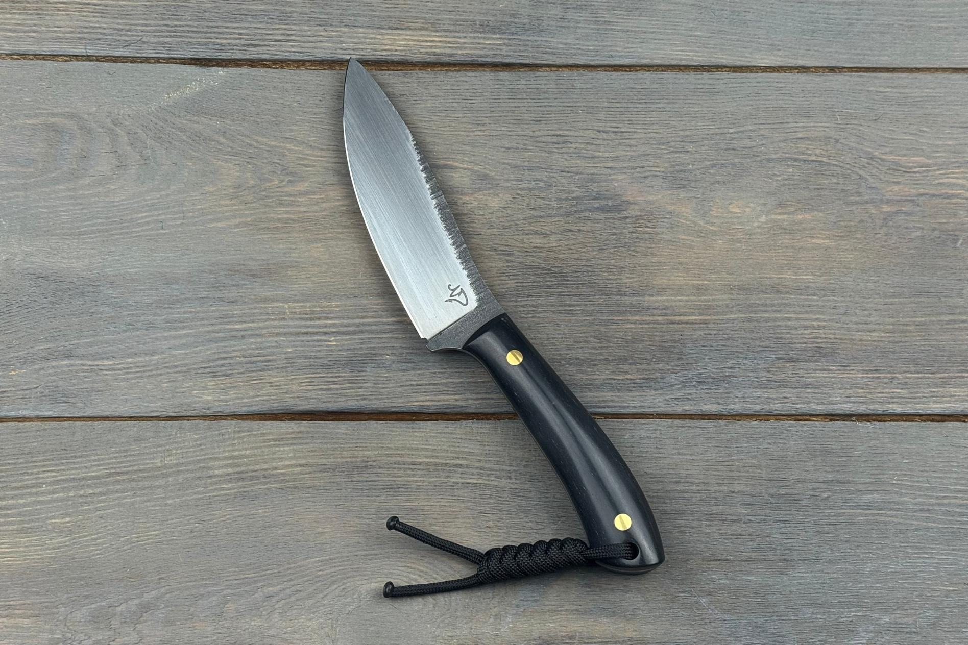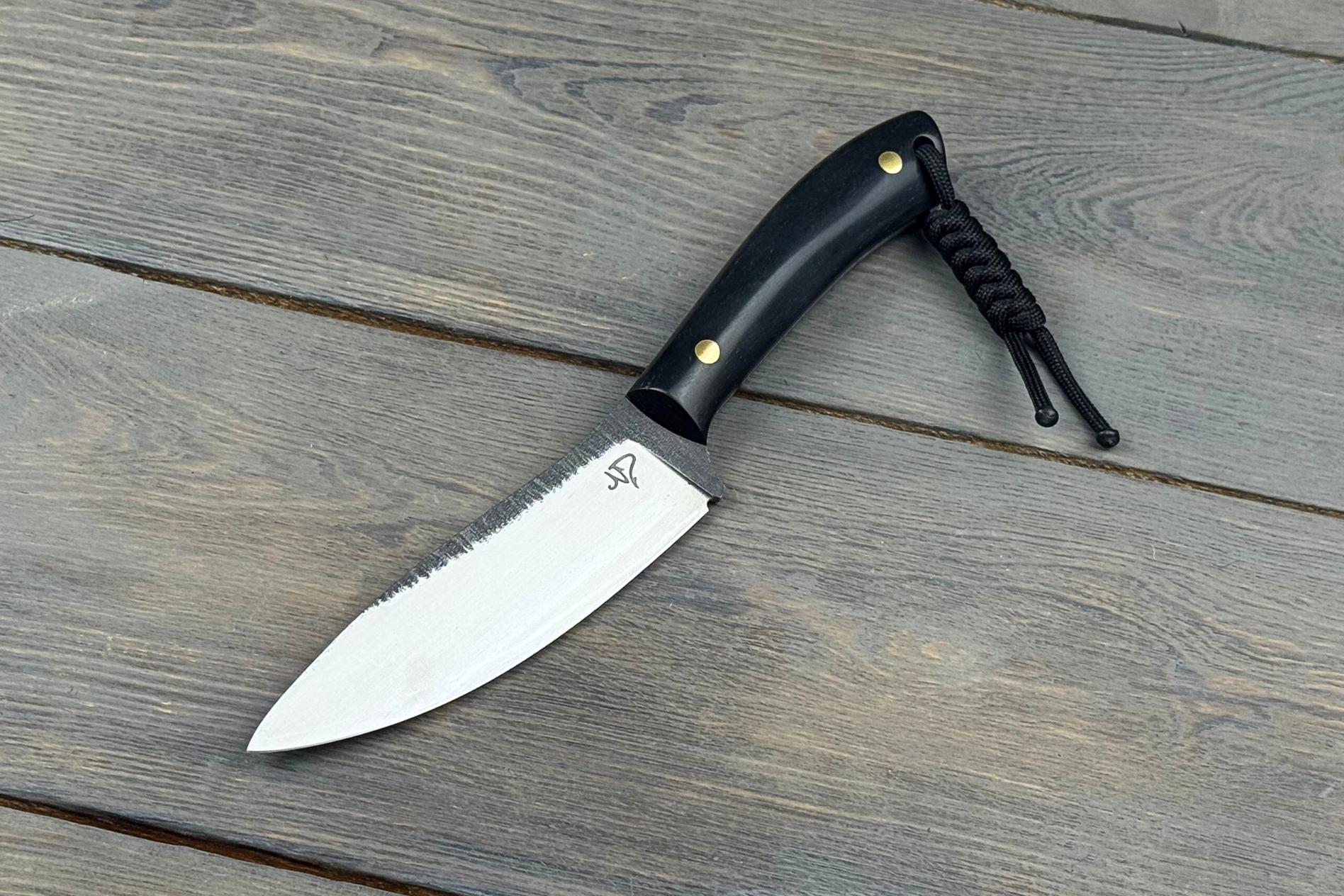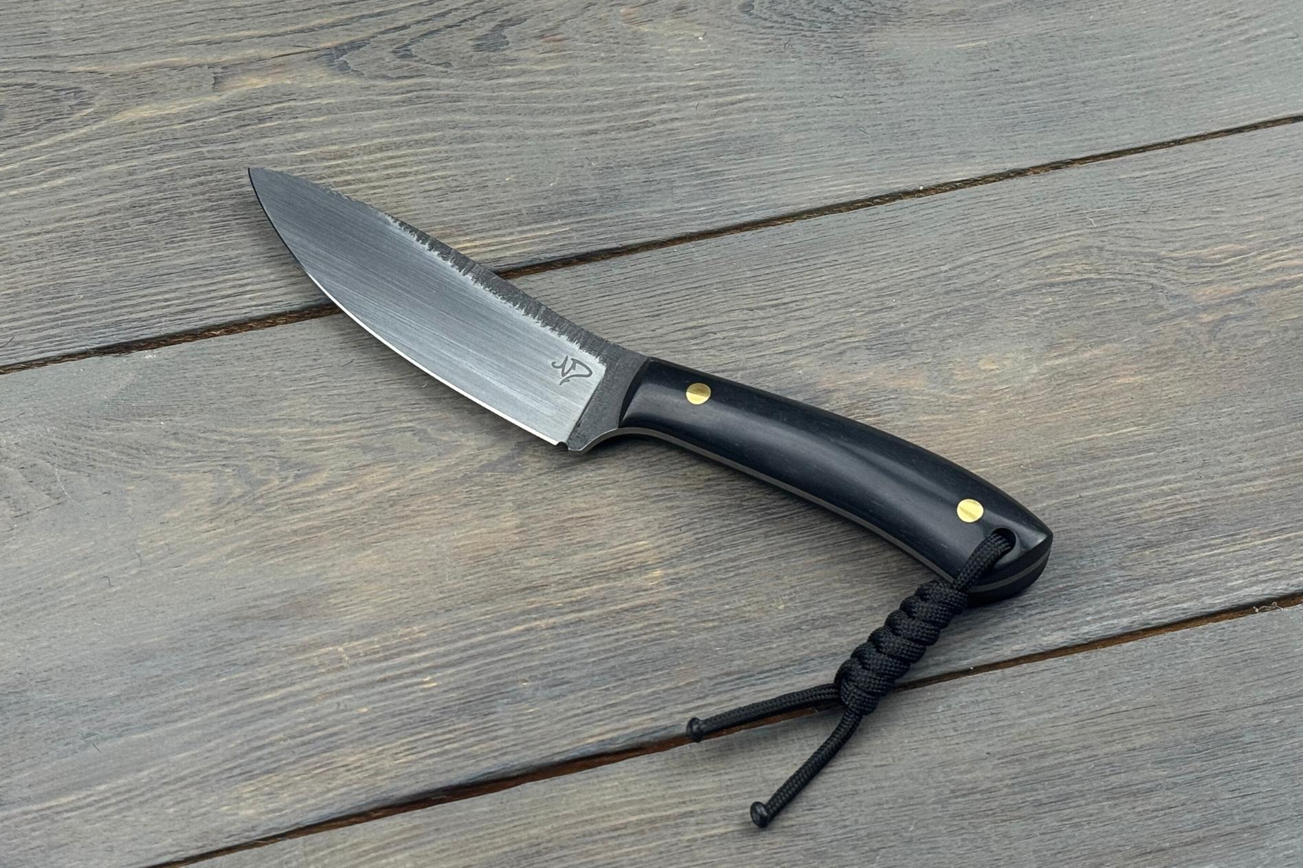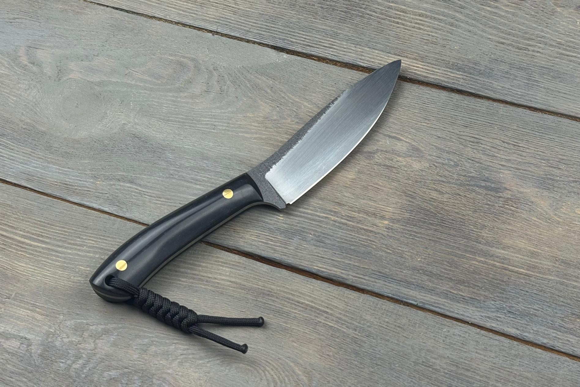 Руків’я виконане з паперової мікарти — матеріалу, що поєднує натуральну текстуру та високу міцність. Вона приємна на дотик, забезпечує впевнений хват навіть у вологих умовах та додає виробу унікального характеру. Чорне руків’я підкреслює строгий і сучасний стиль ножа, роблячи його універсальним як для роботи, так і як колекційний екземпляр.
