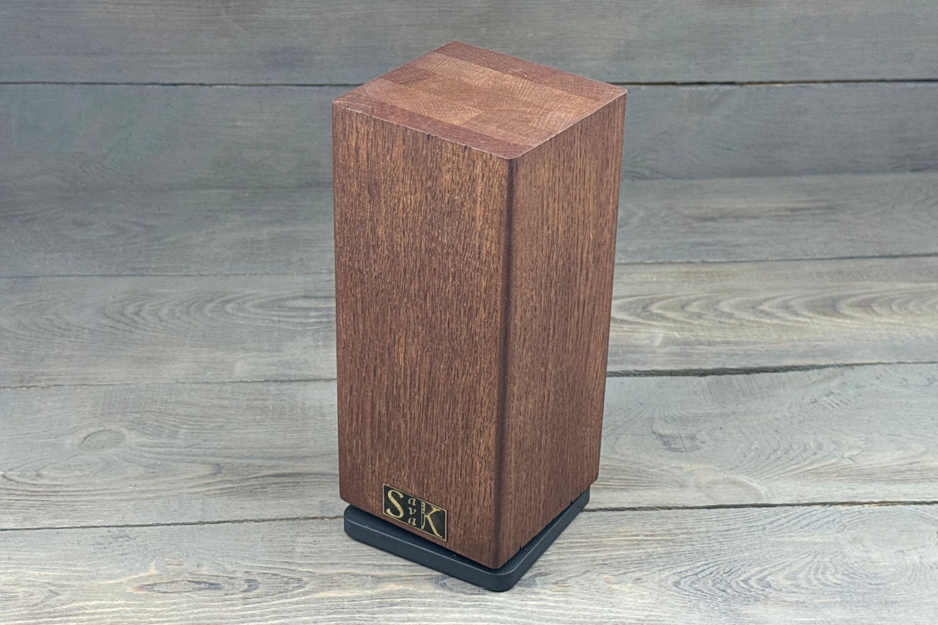Підставка виготовлена з натурального дуба, який відомий своєю міцністю, довговічністю та красивою природною текстурою. Теплий відтінок Brown підкреслює натуральність дерева та гармонійно вписується у класичний або сучасний кухонний інтер’єр. Магніти вбудовані всередину деревини, вони надійно утримують ножі та зберігають їх у зручному доступі. Підшипник дозволяє легко обертати підставку навколо своєї осі, забезпечуючи доступ до будь-якого ножа з усіх боків. Силіконові ніжки: надають стійкість конструкції та захищають поверхню столу від подряпин.