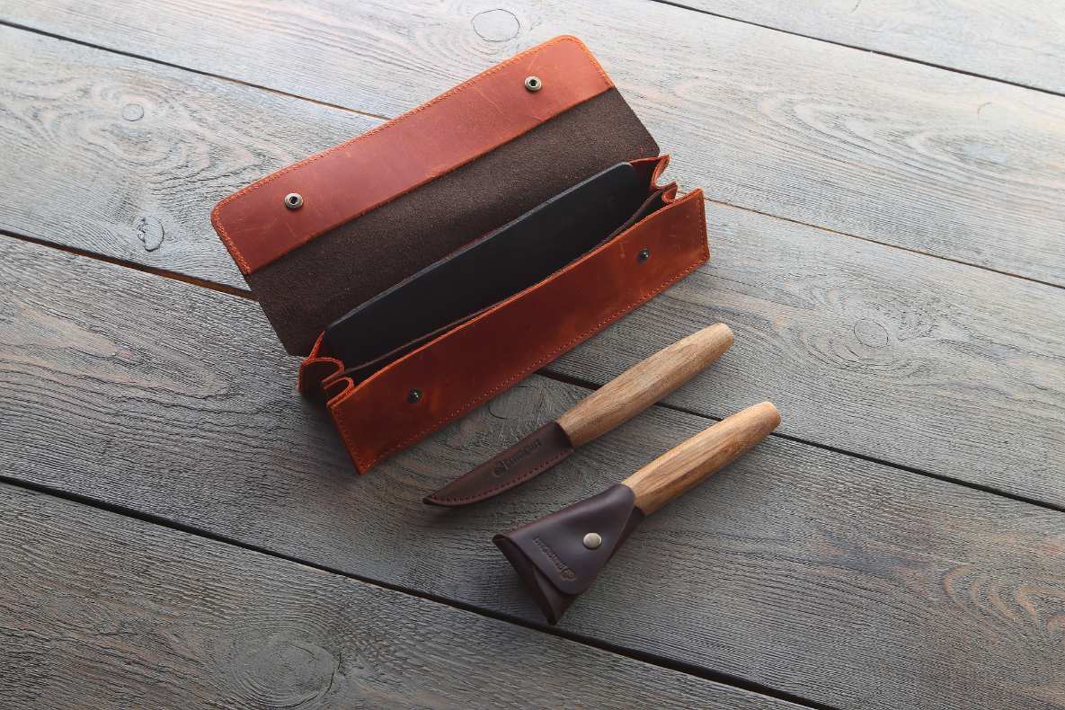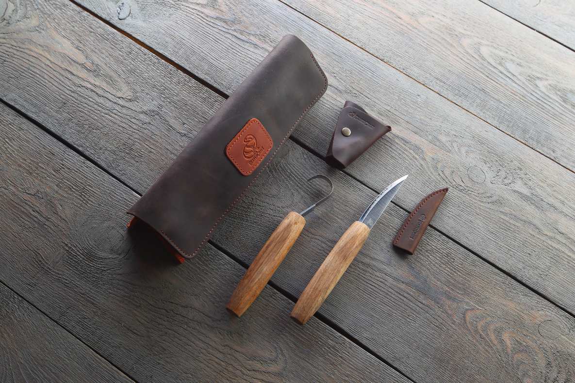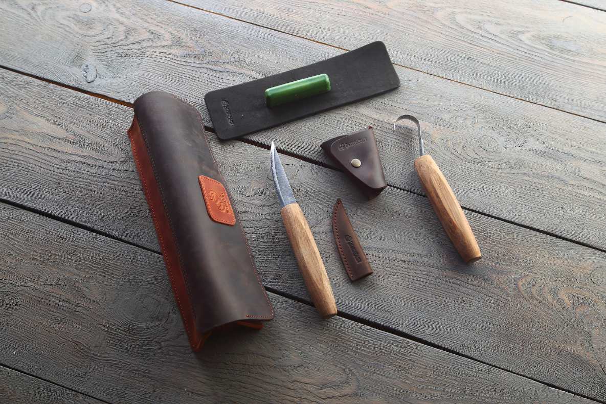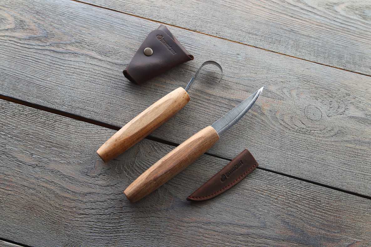 У центрі набору – дві незамінні складові: ніж для стругання C4 і ніж для різьблення ложок SK5R з глибоким скосом: