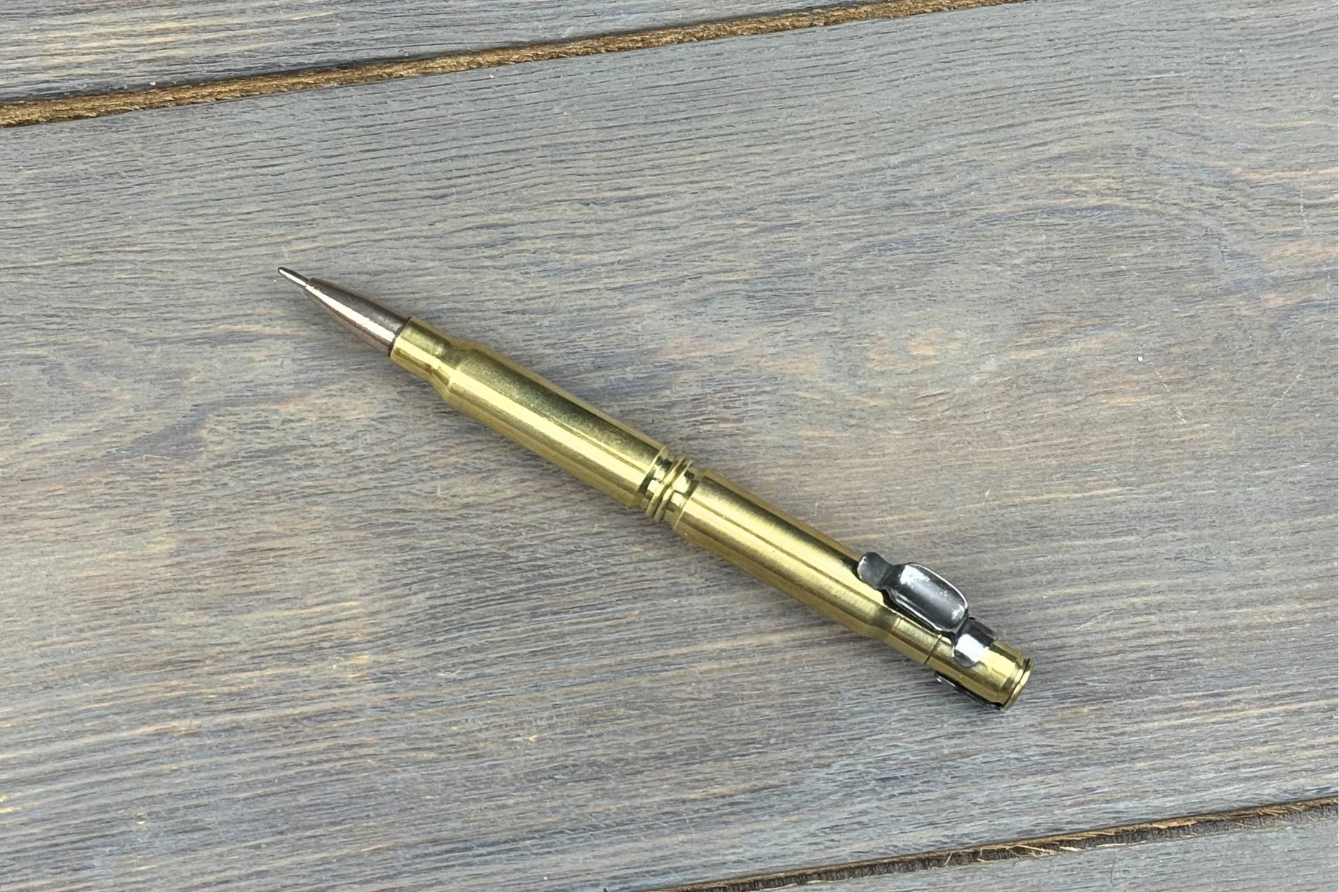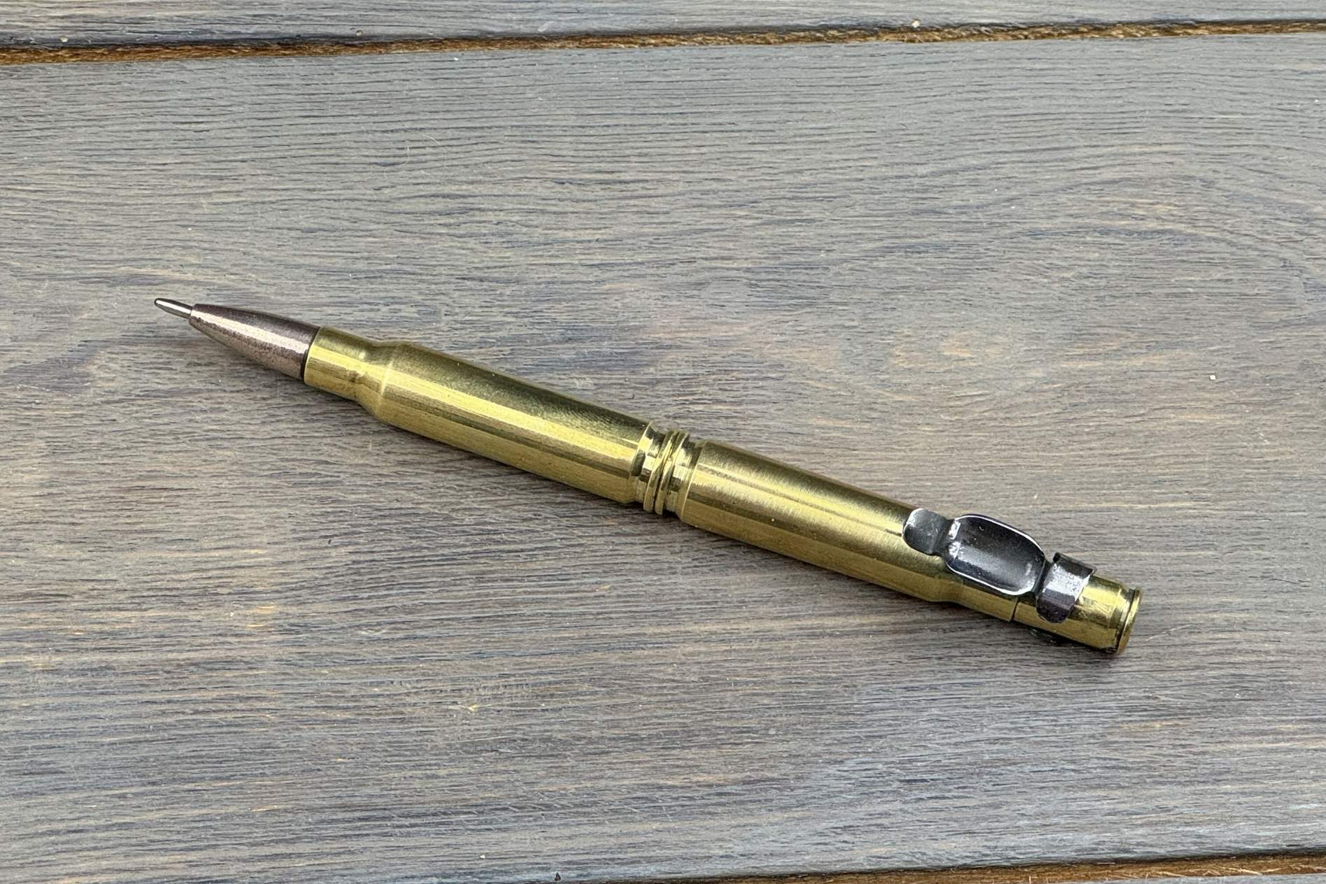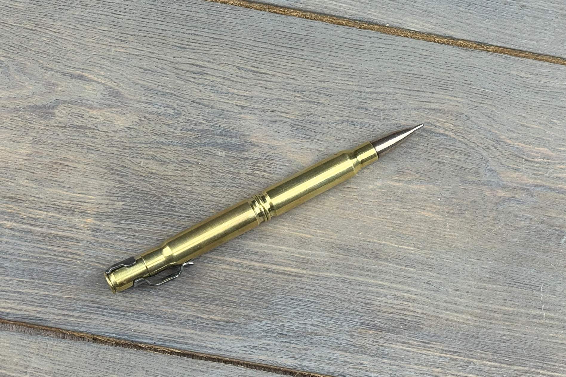 Композиція ручки побудована на гармонійному поєднанні різних калібрів. Дві гільзи 7,62×51 формують основну частину корпусу, а гільза 5,54×45 додає візуального контрасту та плавного переходу діаметрів.