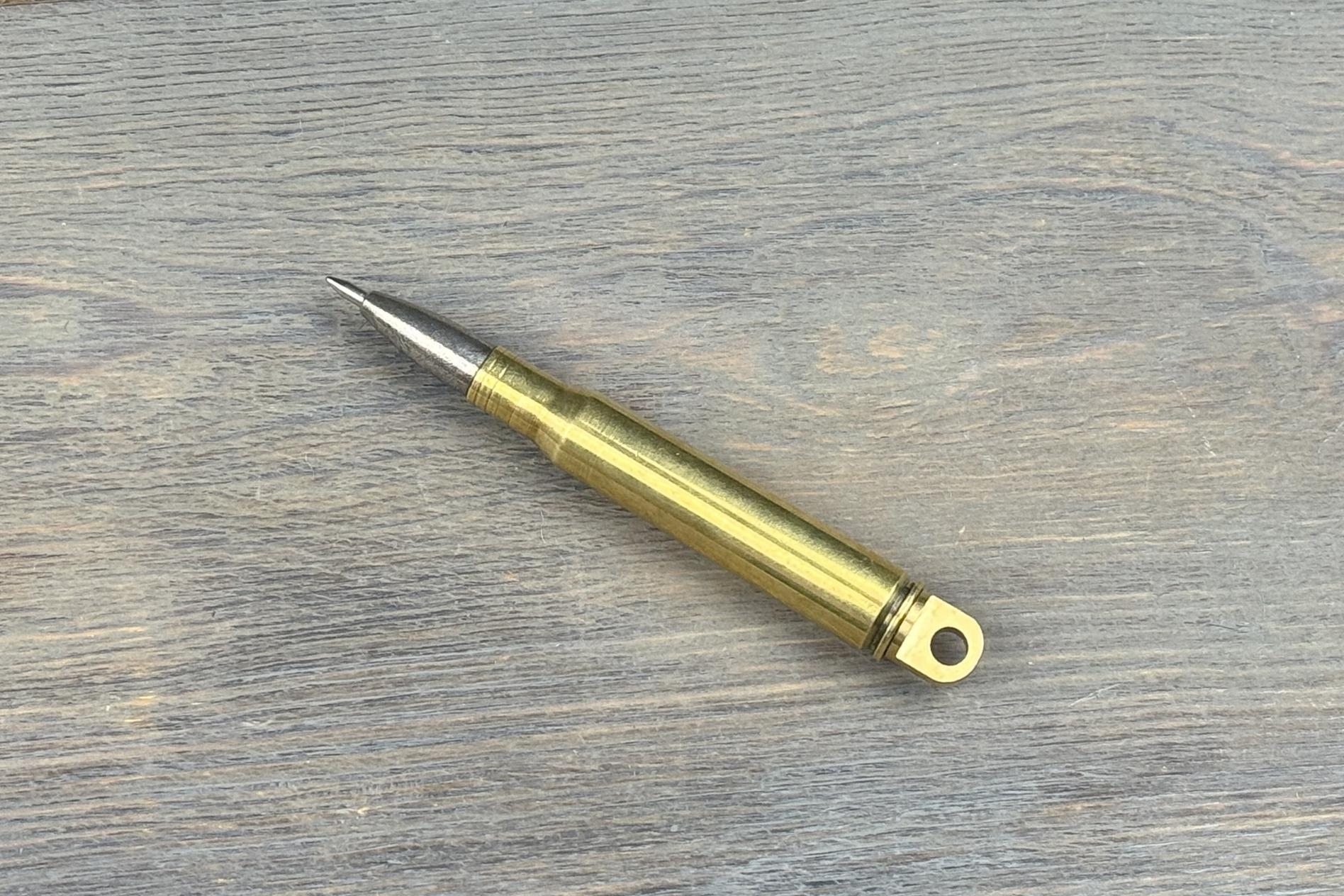 Гільза 7,62×63 формує корпус, а куля 7,62 мм органічно завершує композицію. Виріб має акуратний силует і невелику довжину, що робить його зручним для носіння в кишені, невеликому блокноті чи органайзері.