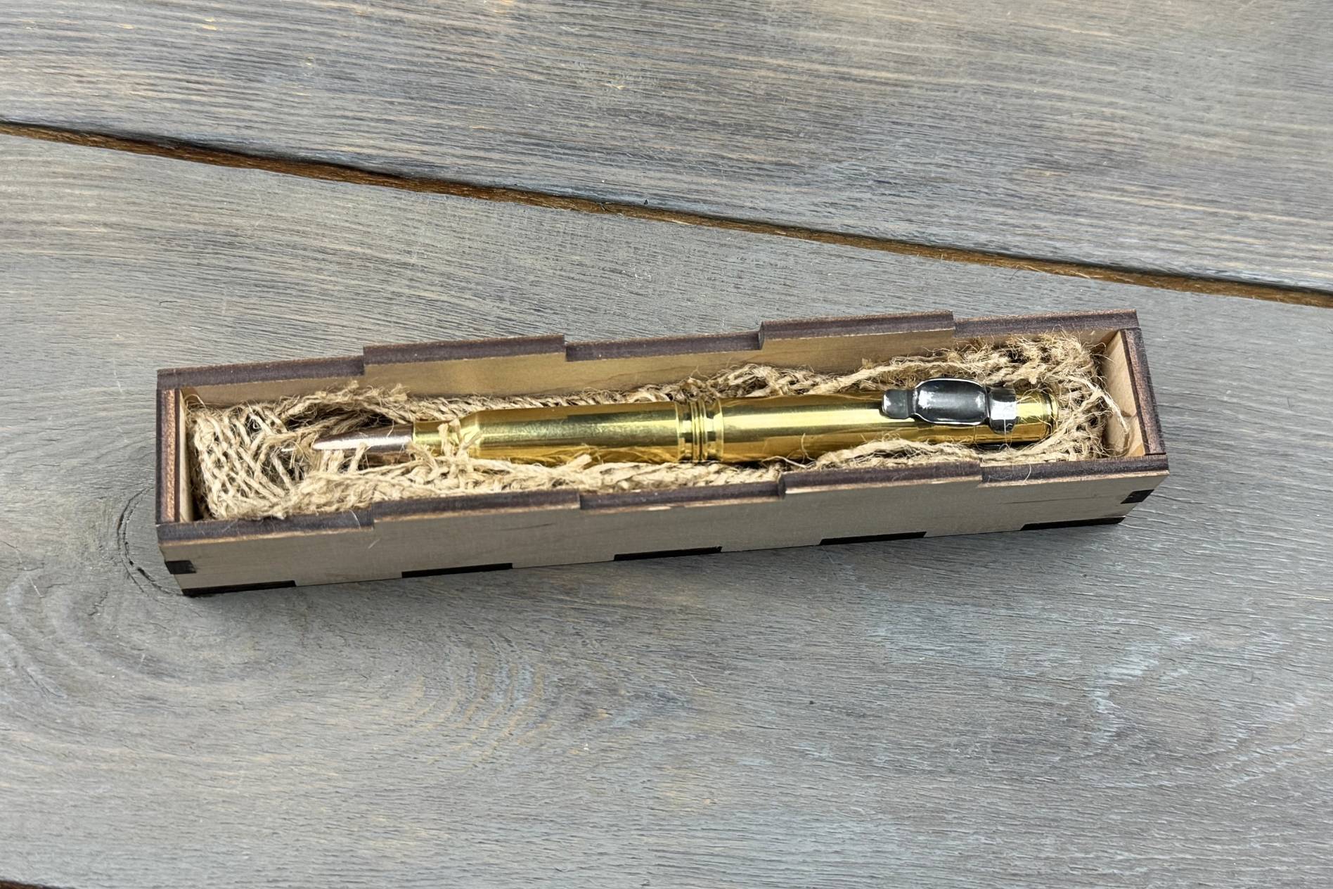 Ручка №4 «Письмові Набої» — це компактний авторський письмовий інструмент, створений із однієї латунної стріляної гільзи та кулі калібру 7,62 мм. Лаконічна конструкція підкреслює форму та пропорції матеріалів, зберігаючи їхню природну естетику.