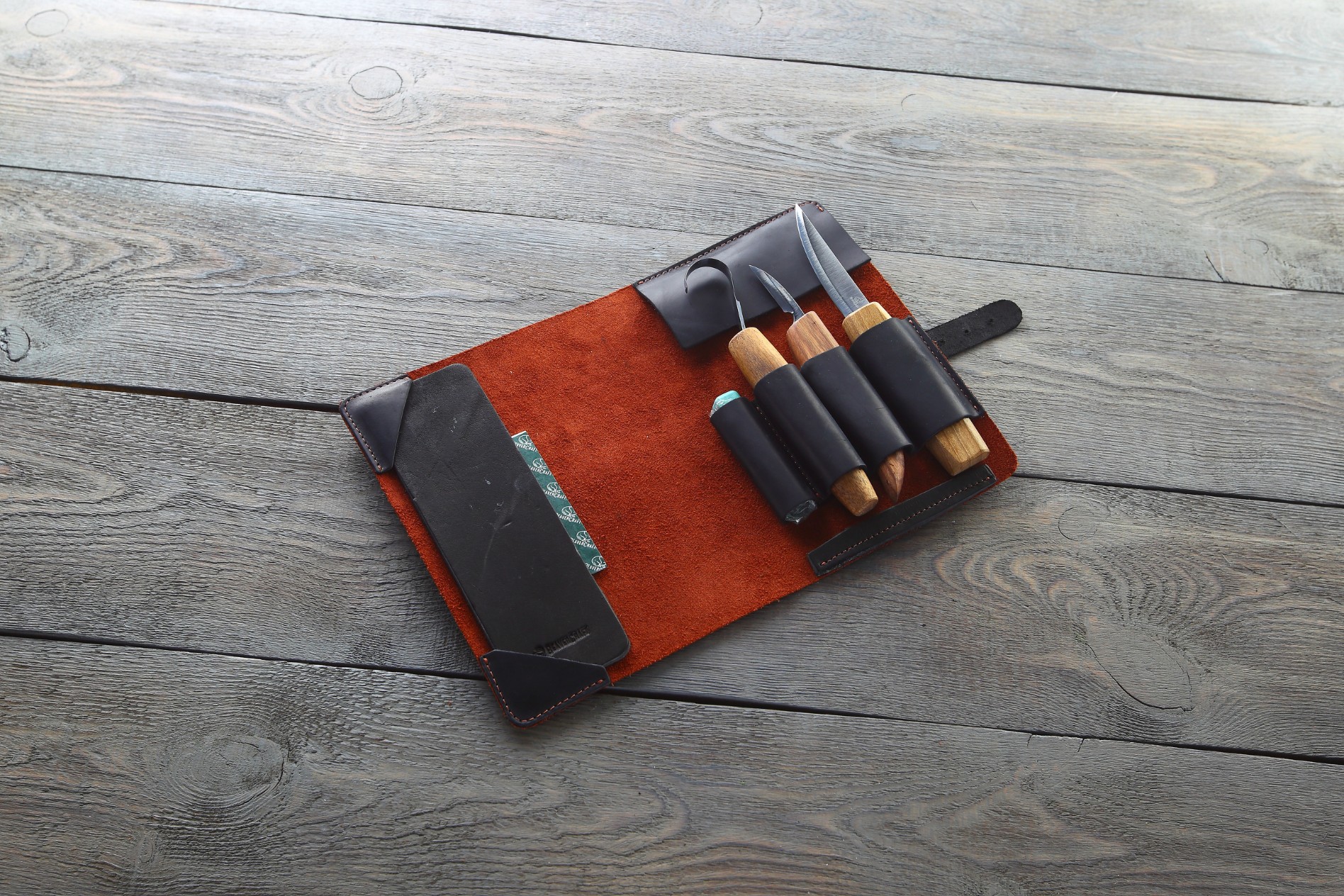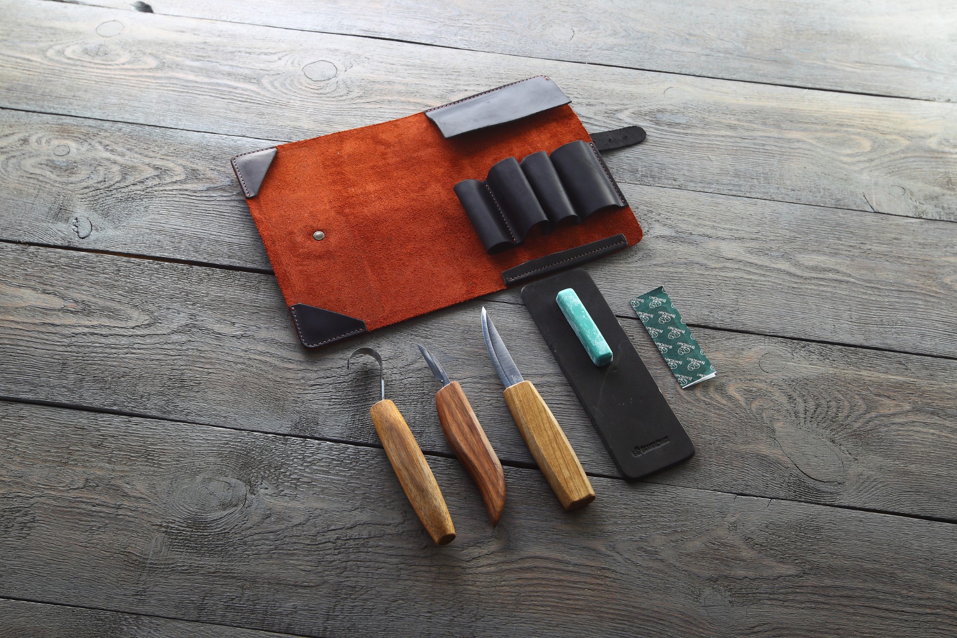 Інструменти укомплектовані чохлом із натуральної шкіри, щоб зберігати їх в одному місці. Також до набору входять мікронна полірувальна суміш та шкіряна стропа. Усе що потрібно для догляду за ножами.