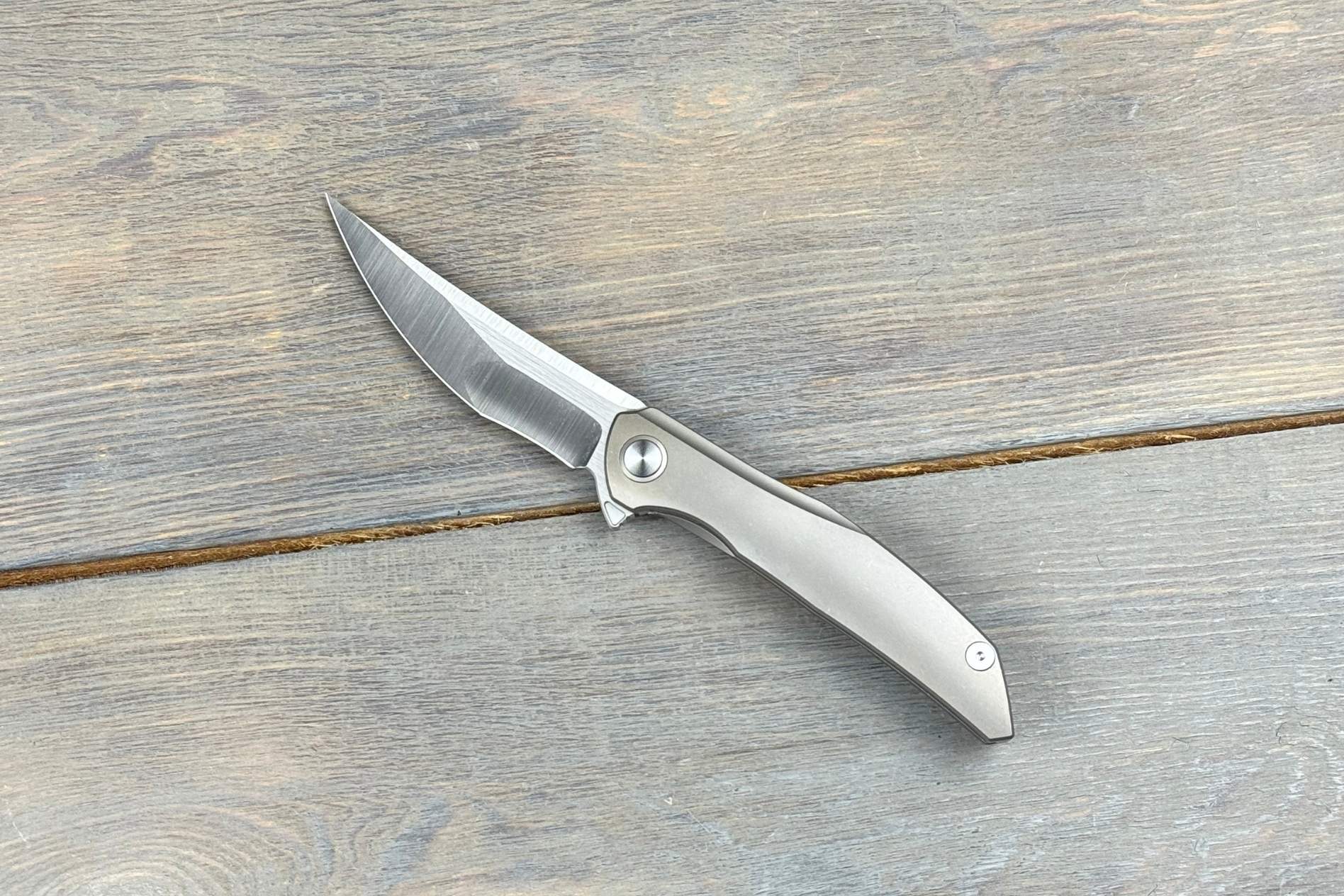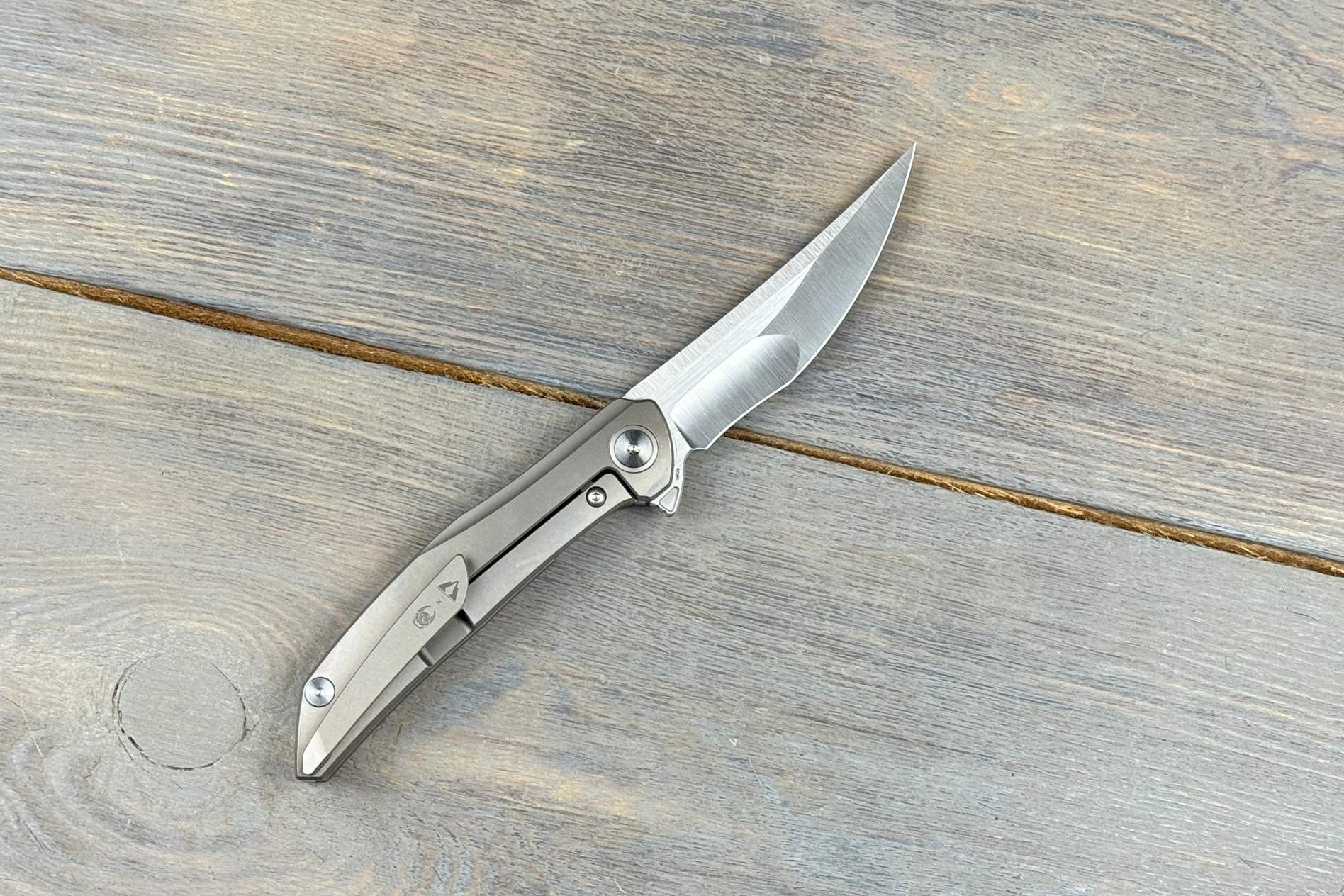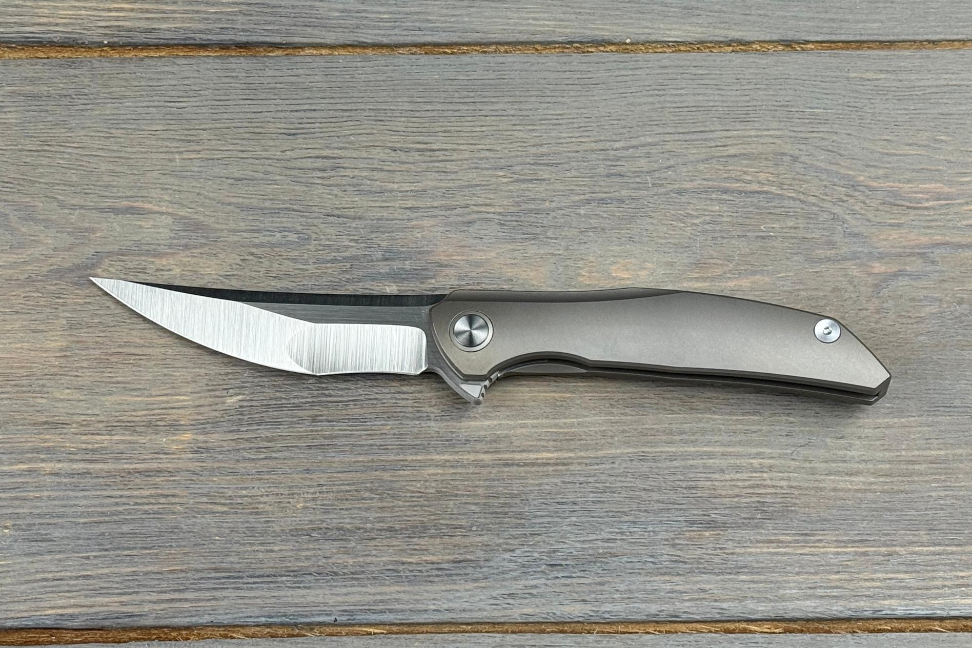 Руків’я із титану 6AL4V довжиною 105 мм має приємну текстуру та темно-сіре забарвлення, яке додає ножу стриманого характеру. Титанова кліпса, виконана у тому ж стилі, забезпечує надійне й непомітне кріплення. Легкість конструкції — усього 73 г — робить ніж особливо зручним для постійного носіння.