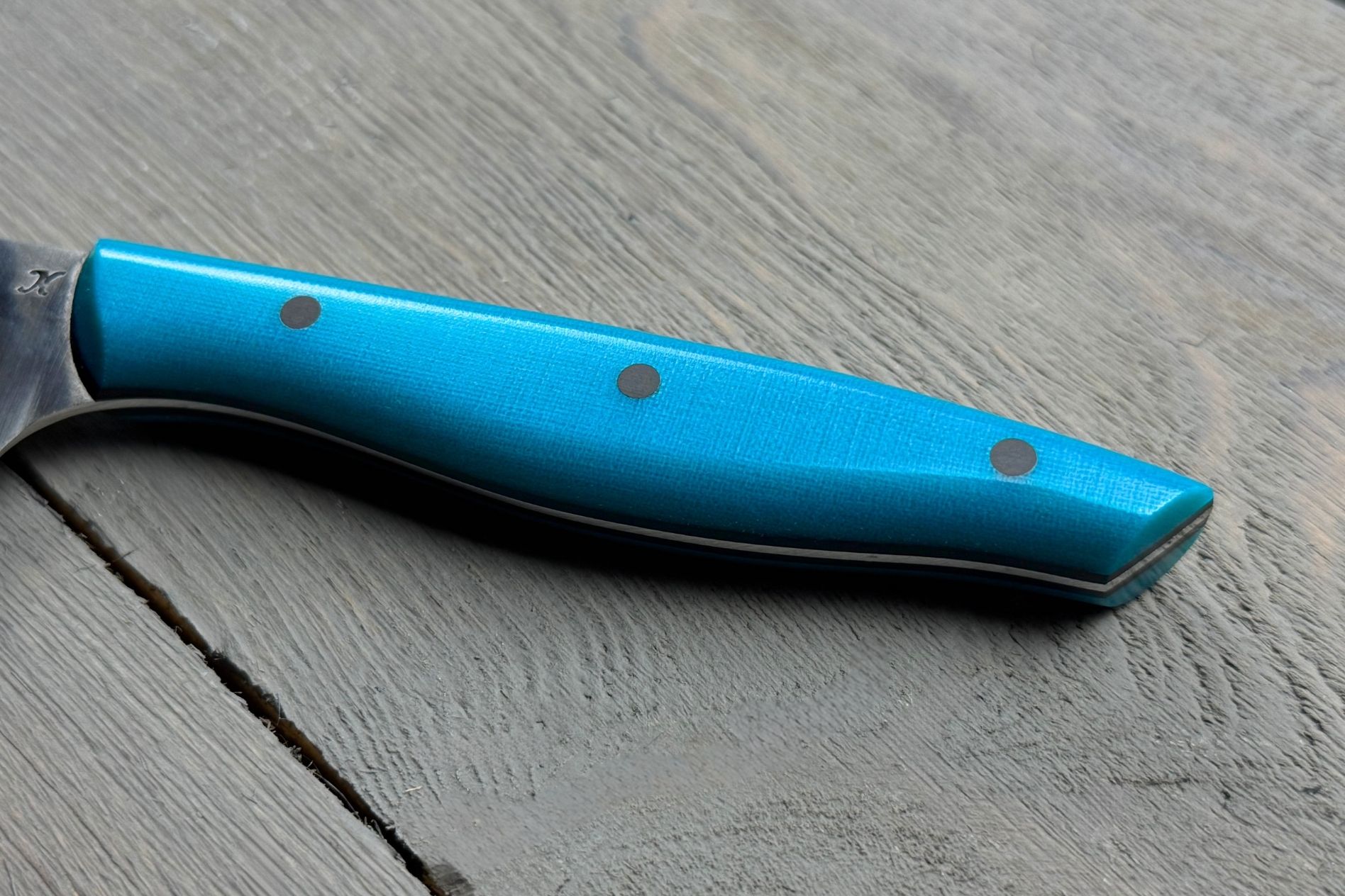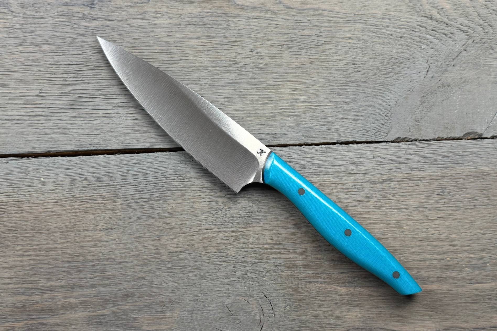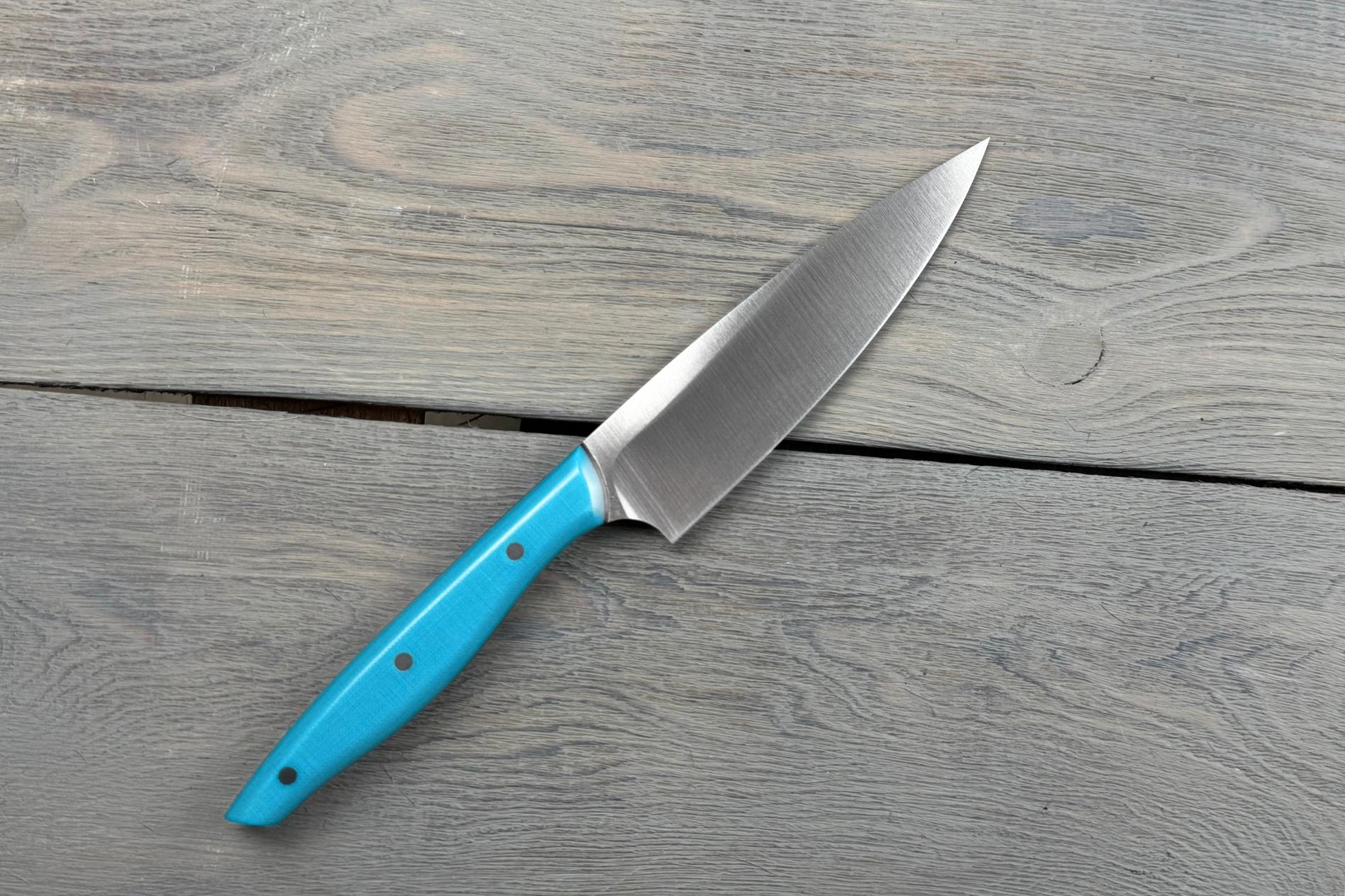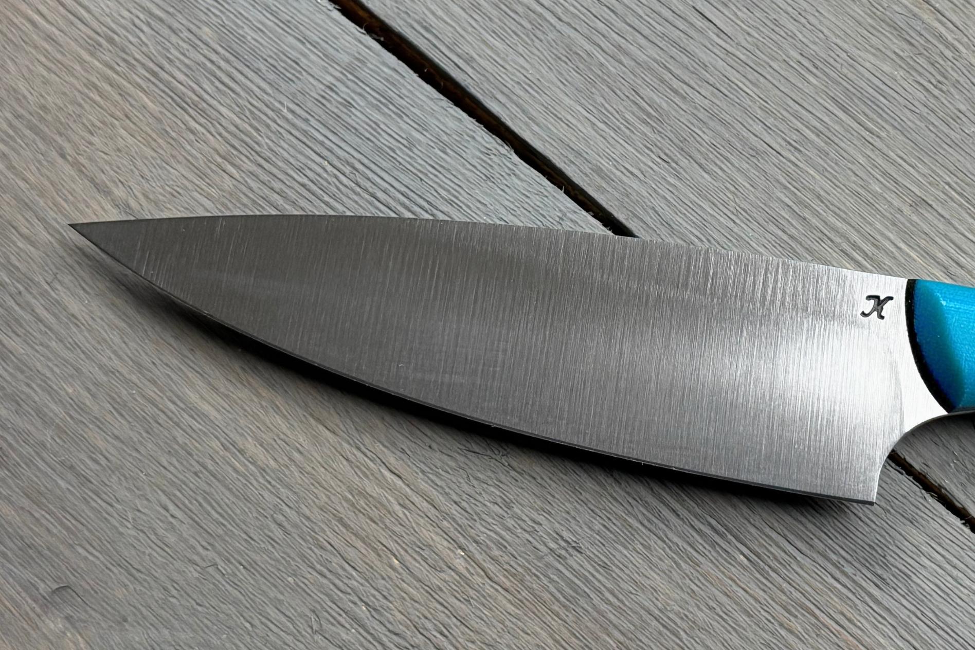 Шеф-ніж Blue від Майстерні Олександра Крутька — це кухонний ніж для щоденного користування, розроблений з урахуванням основних потреб на кухні. Він зручний у руці, добре збалансований і не вимагає складного догляду. Підійде тим, хто хоче мати один ніж для більшості базових задач: нарізання овочів, фруктів, зелені, обробки м’яса або риби.