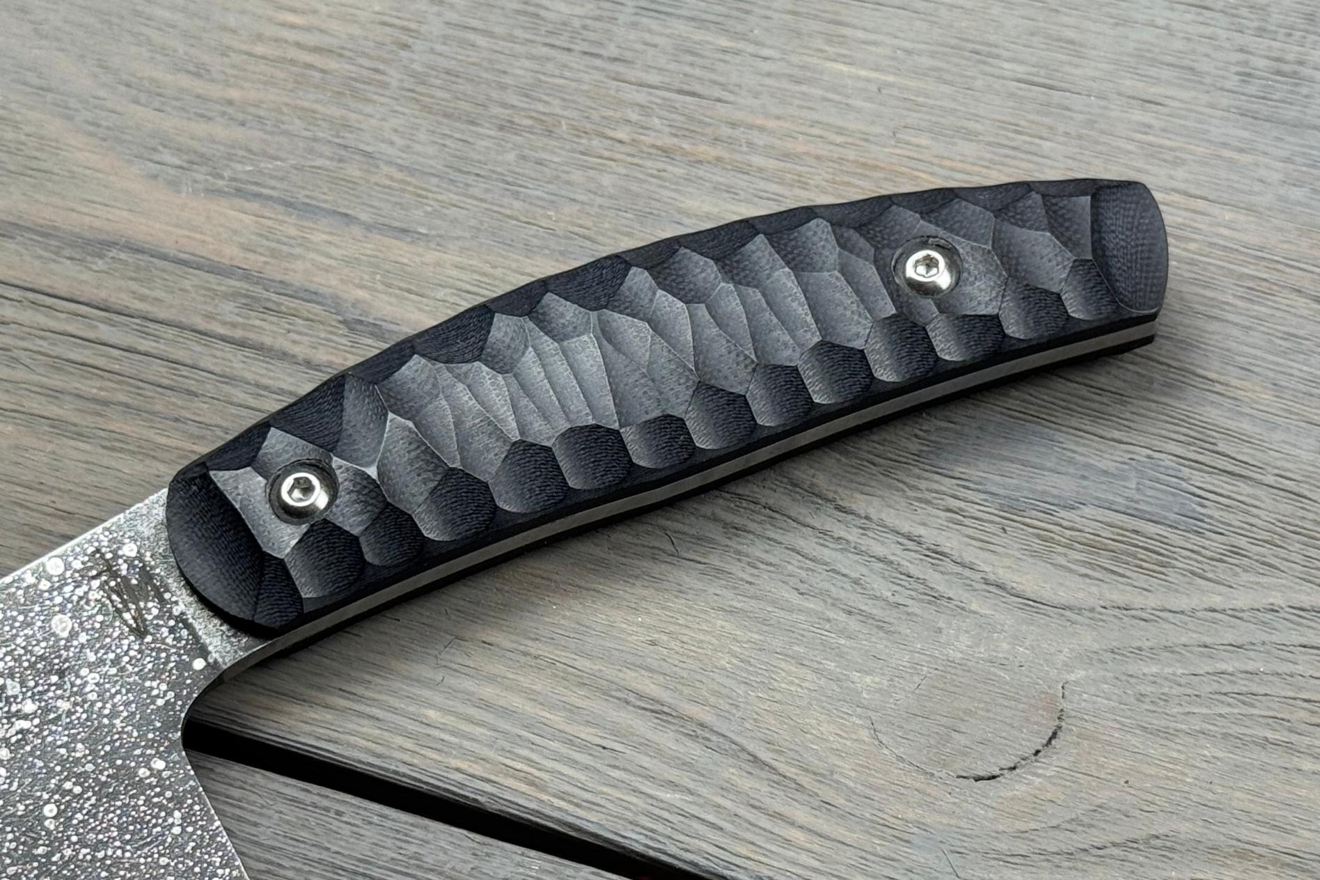 Ніж оснащений руків’ям із G10 — сучасного, міцного та вологостійкого композиту. Цей матеріал не ковзає в руці, не боїться жиру. Завдяки довжині 120 мм і зручній формі, руків’я добре лежить у руці навіть при тривалій роботі, не спричиняючи втоми.