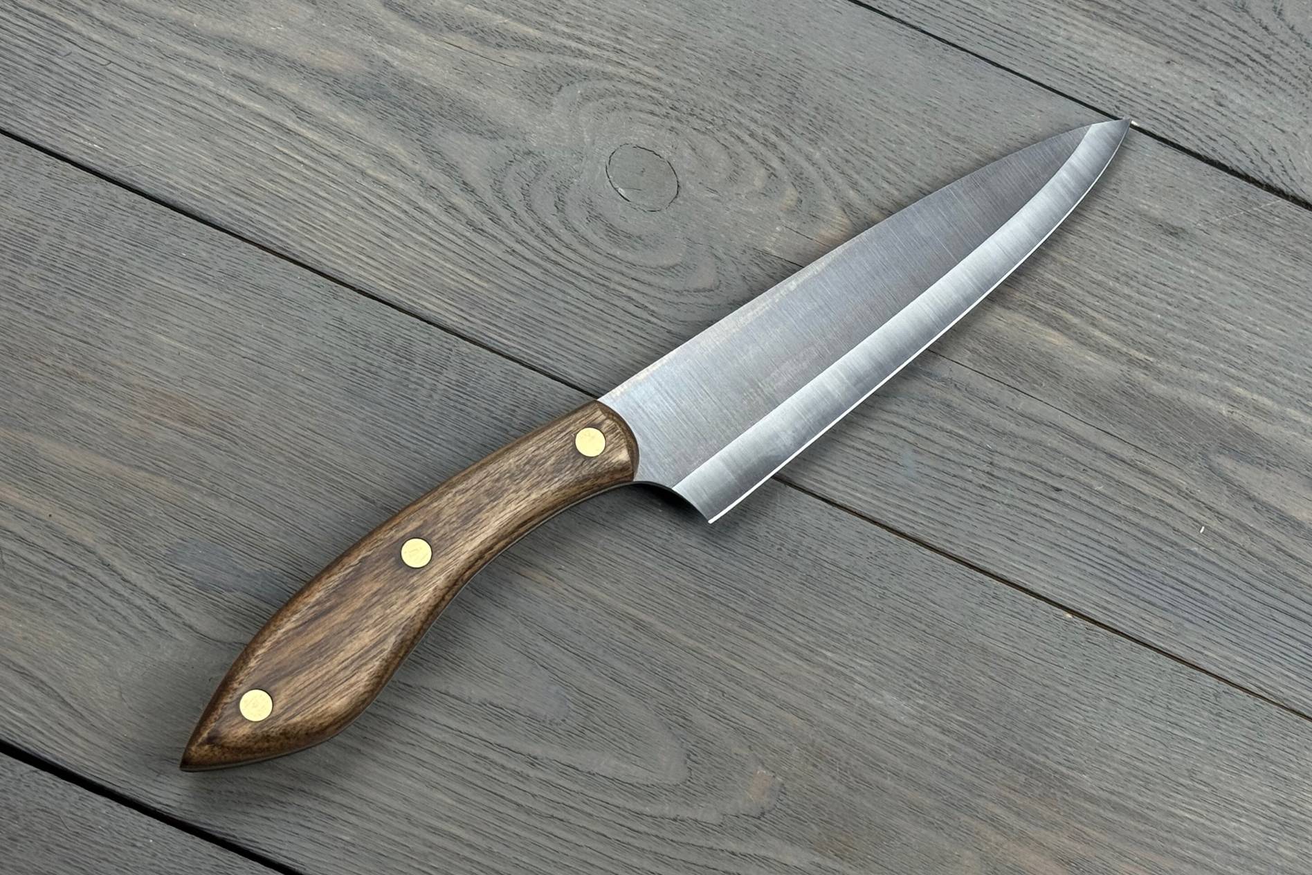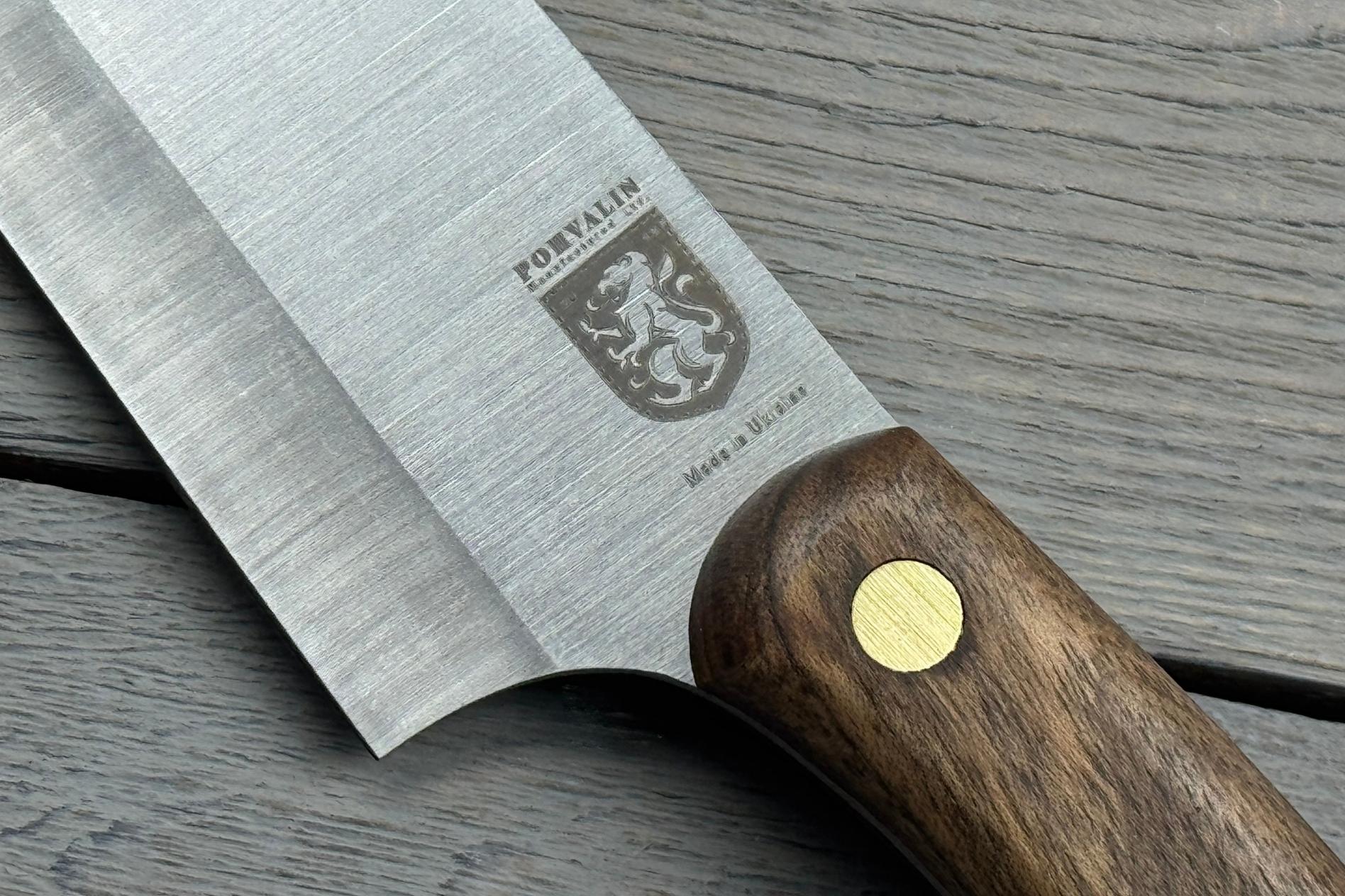 Шеф-ніж (Pohvalin) — це кухонний ніж, який поєднує в собі функціональність, надійність та індивідуальний підхід до кожної деталі. Від увігнутих спусків на лезі до руків’я з натурального горіха — усе в цій моделі говорить про майстерність і розуміння потреб кухаря. Загальна довжина ножа — 320 мм, вага — 165 г: оптимальні параметри для точного контролю й приємної роботи. Цей ніж буде чудовим інструментом для щоденної кулінарії або гідним подарунком для тих, хто цінує ручну працю й натуральні матеріали.