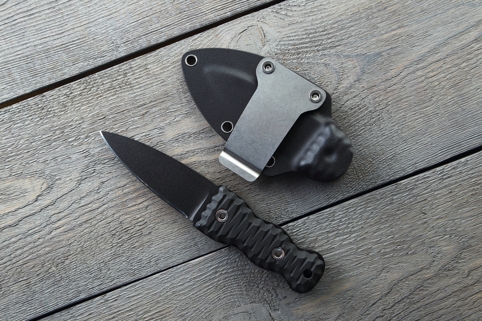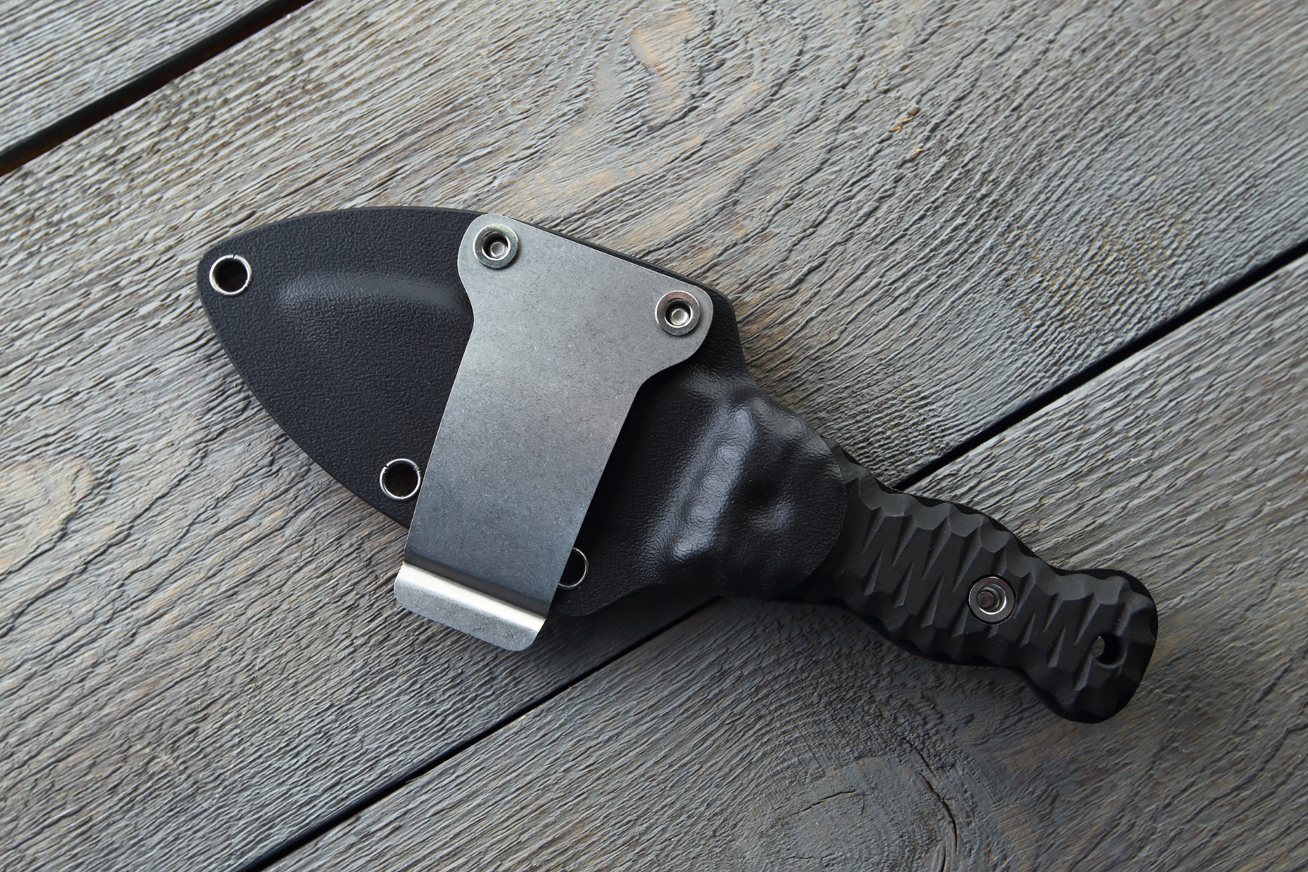 До комплекту входить пластиковий чохол, який забезпечує надійне утримання та можливість прихованого носіння. Сталева знімна кліпса та сумісність з MOLLE роблять ніж зручним для перенесення. Отвори чохла також сумісні з ТЕК ЛОК, дозволяючи налаштовувати носіння під свої потреби.