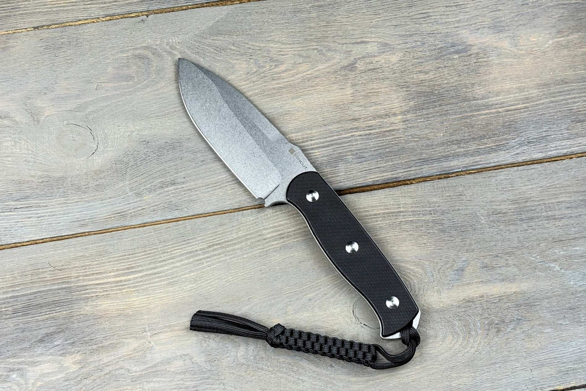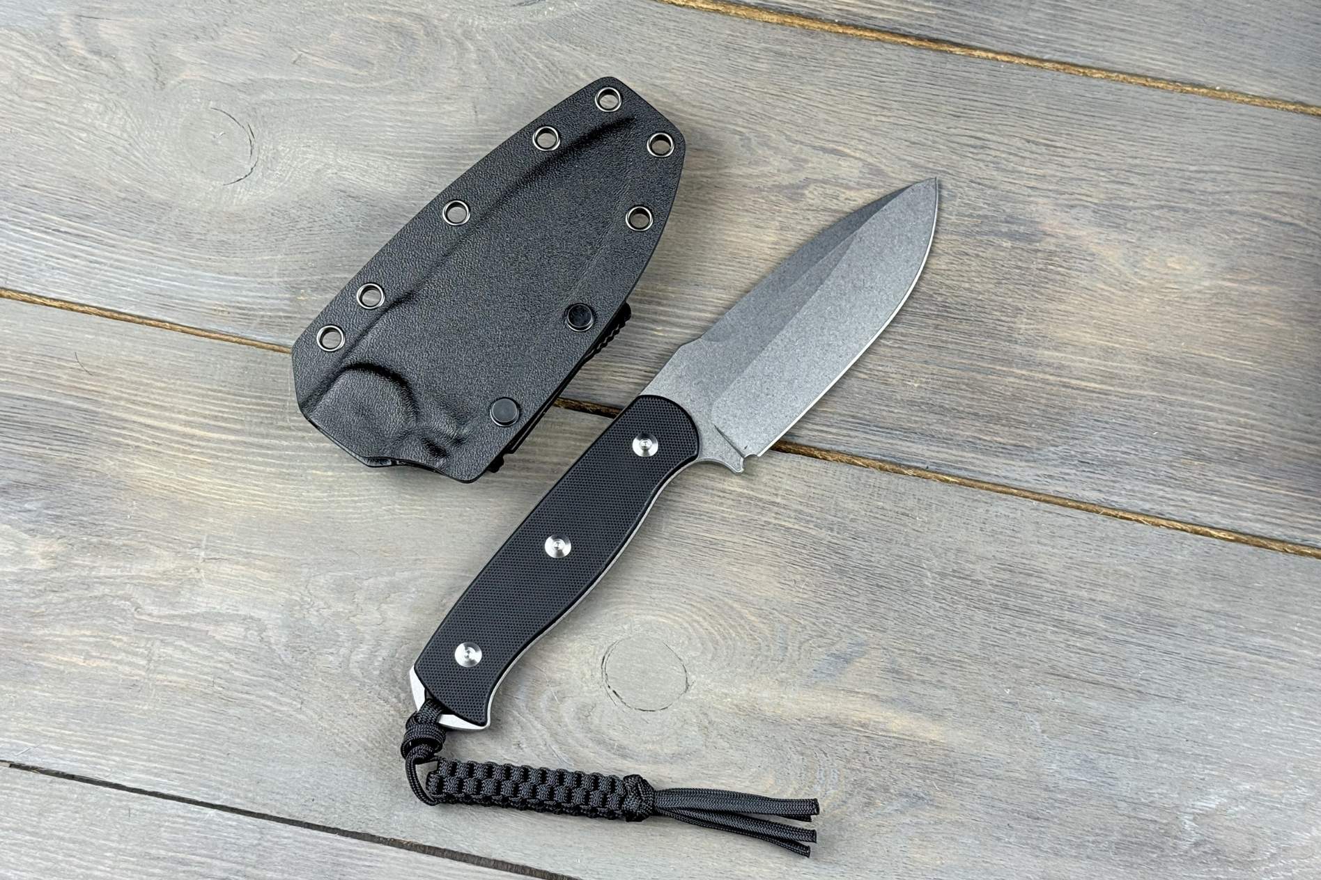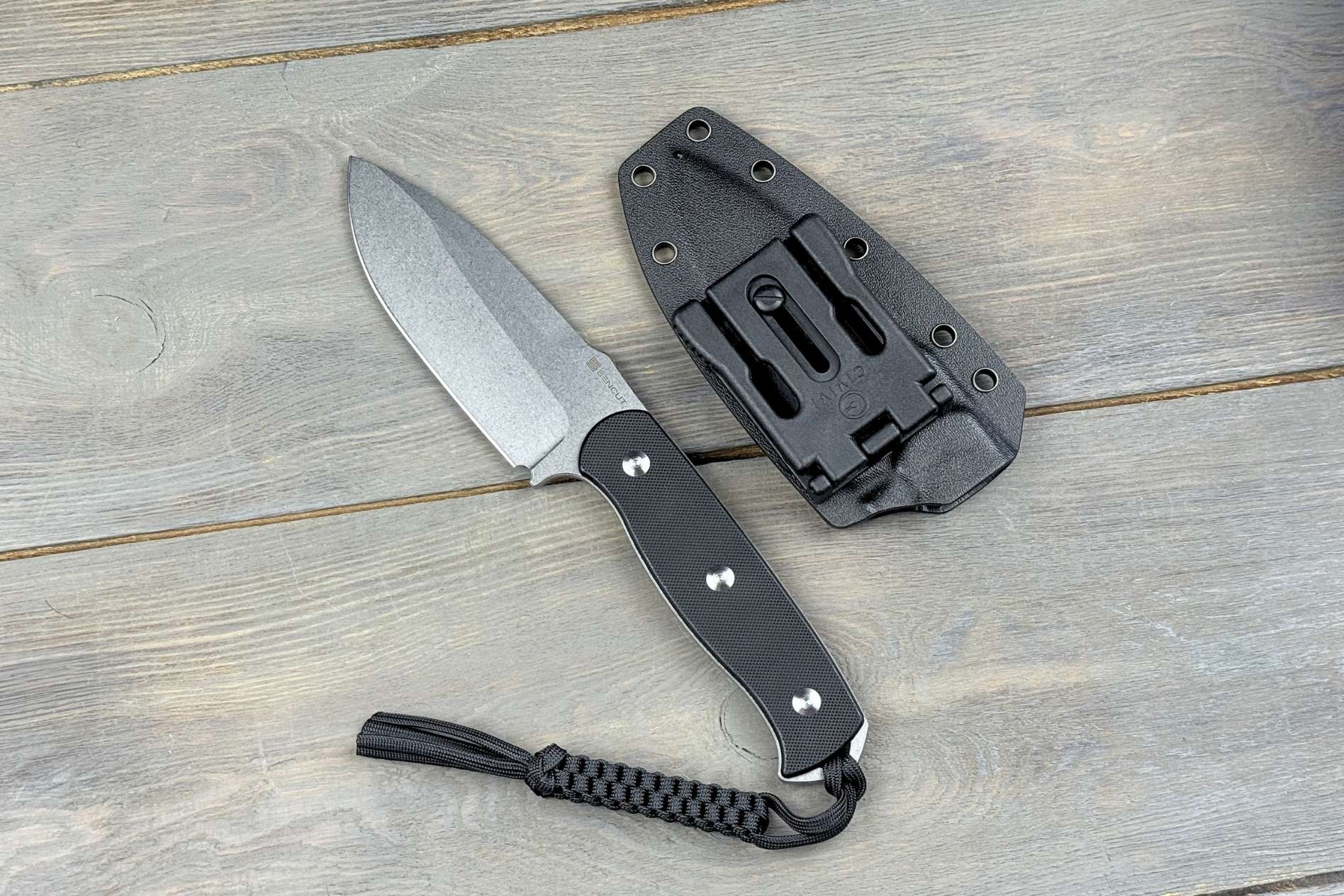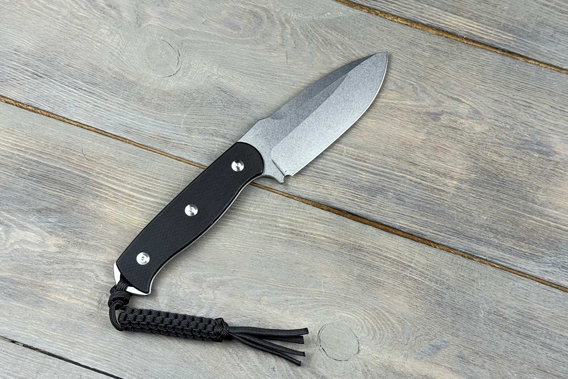 Чорне руків’я з G-10 відзначається високою міцністю, стійкістю до вологи та механічних навантажень. Довжина 127 мм забезпечує повнорозмірний хват, а текстурована поверхня сприяє надійному контролю навіть у складних умовах.