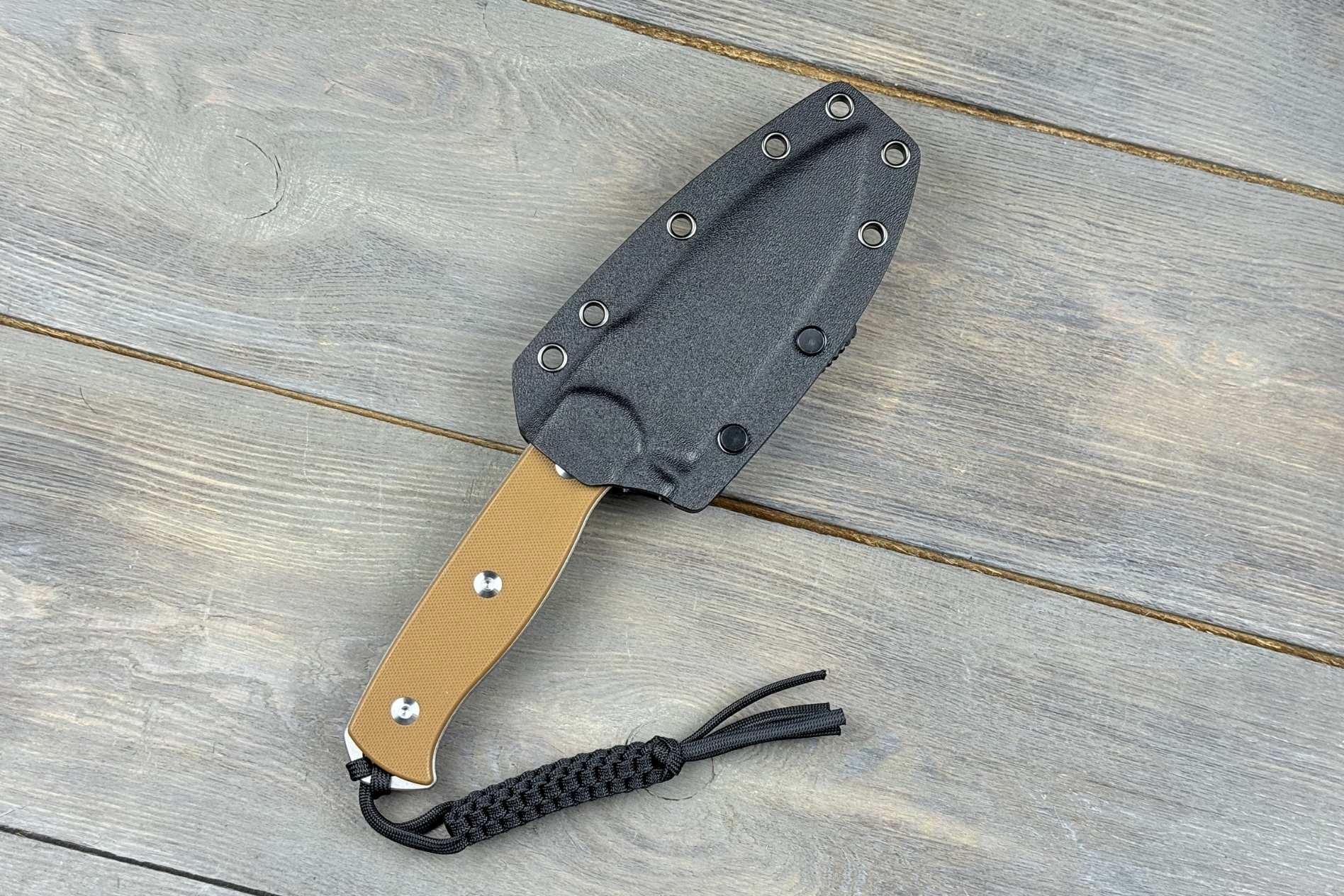 У комплекті з ножем входять якісні ножни, що забезпечують безпечне зберігання та зручне транспортування. Вони надійно фіксують ніж і захищають ріжучу крайку від пошкоджень.