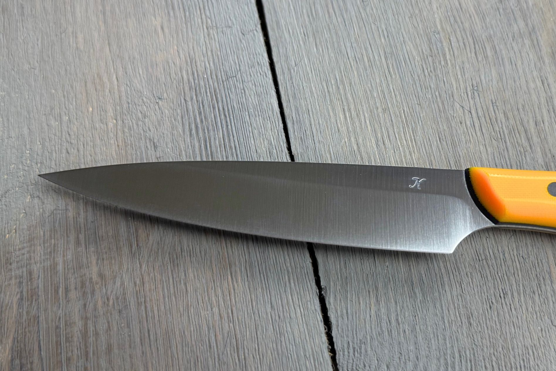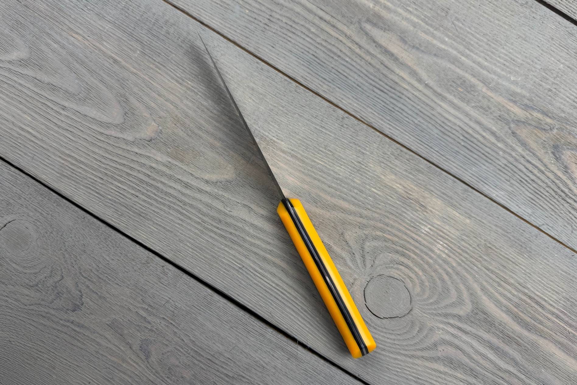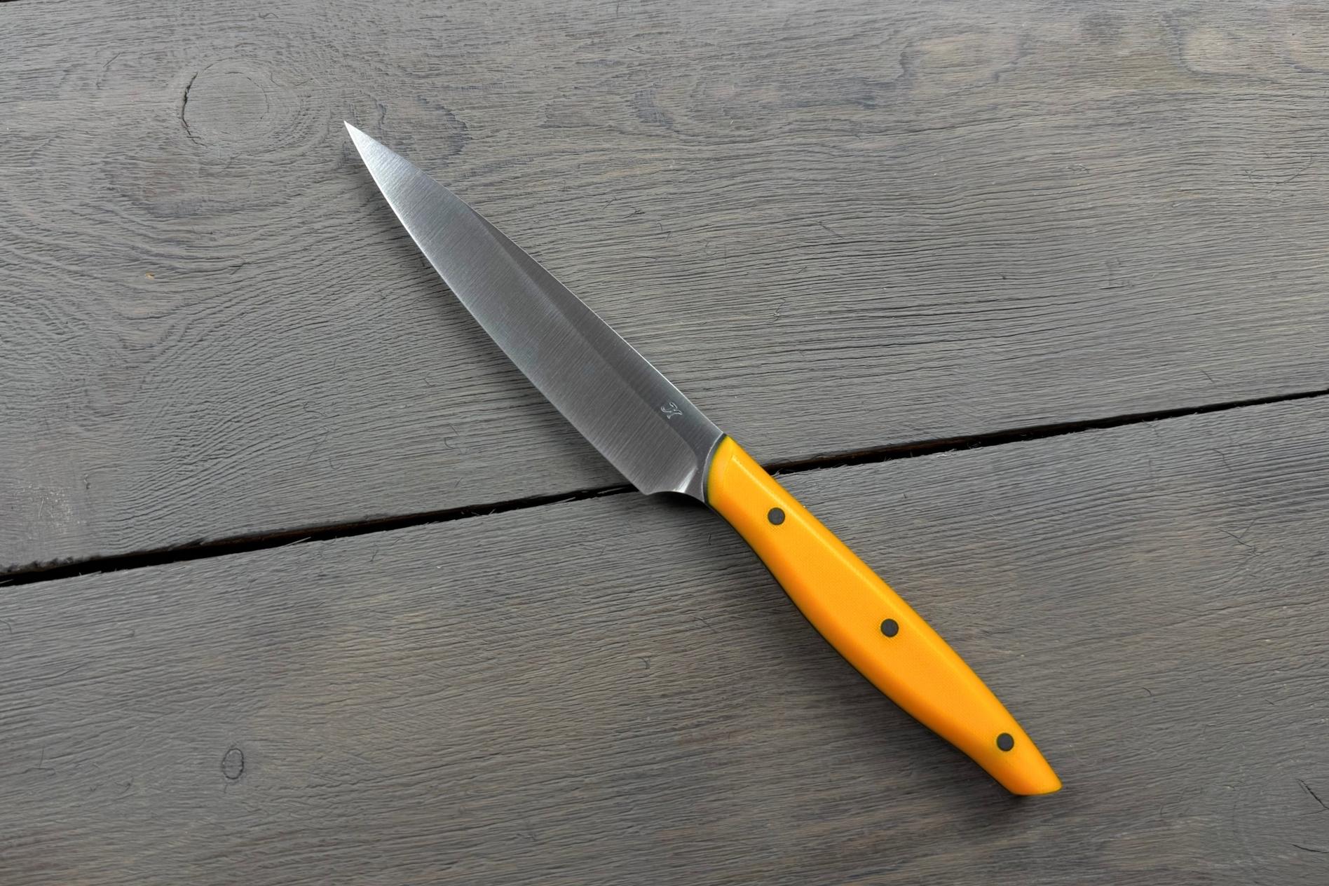 Універсальний ніж Yellow від Майстерні Олександра Крутька— це авторська модель ручної роботи, створена як зручний та легкий інструмент для повсякденного використання на кухні. Завдяки своїм пропорціям і малій вазі, він легко впорається з найрізноманітнішими завданнями: від нарізання овочів і зелені — до м’яса чи риби без кісток.