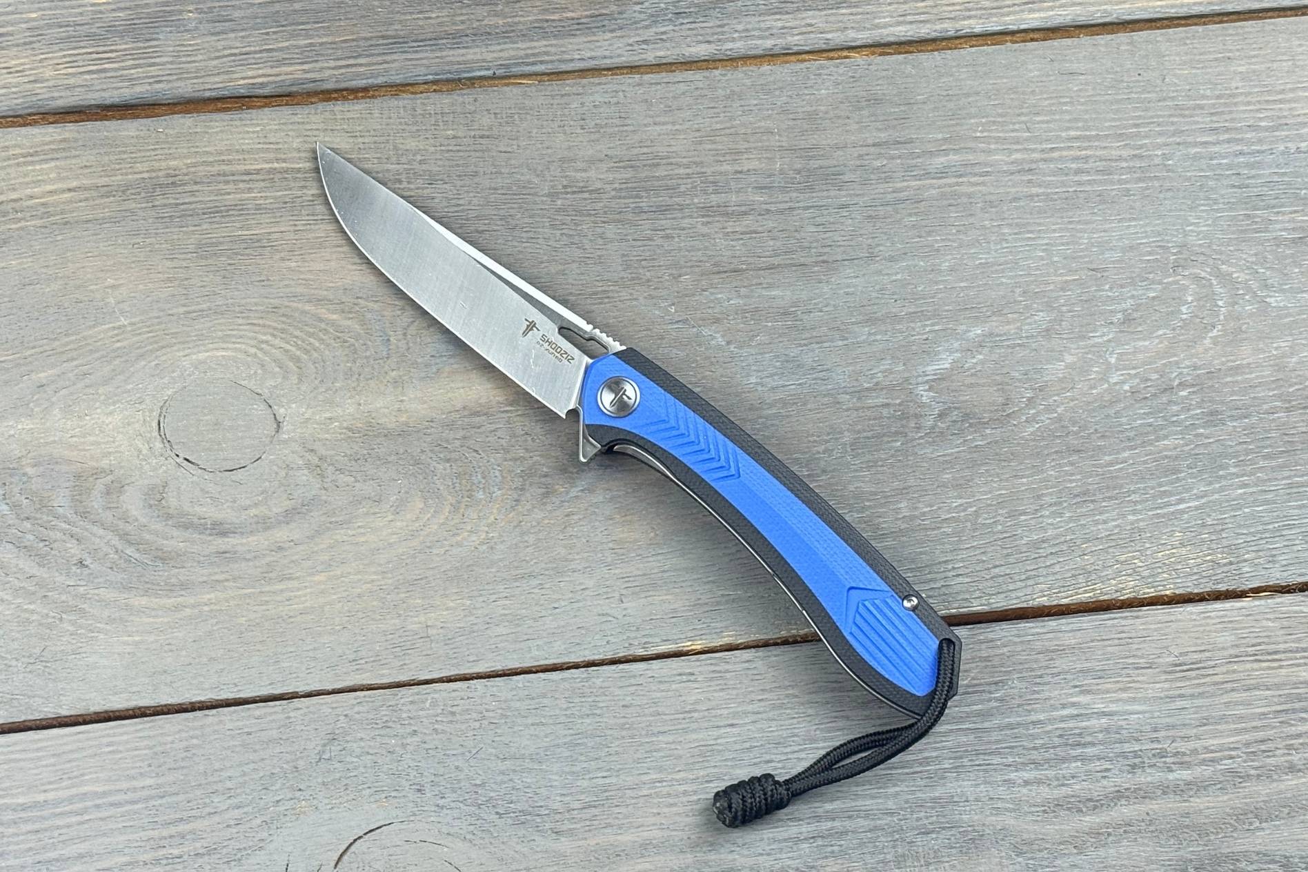 Руків’я виконане з комбінації синього та чорного G10 — матеріалу, який поєднує міцність, легкість та приємну текстуру. Таке поєднання кольорів створює сучасний, динамічний вигляд, а текстурована поверхня гарантує впевнений хват навіть у вологих руках. Цей легкий відкидний ніж зменшує втому долоні, забезпечуючи стабільність під час тривалої роботи.