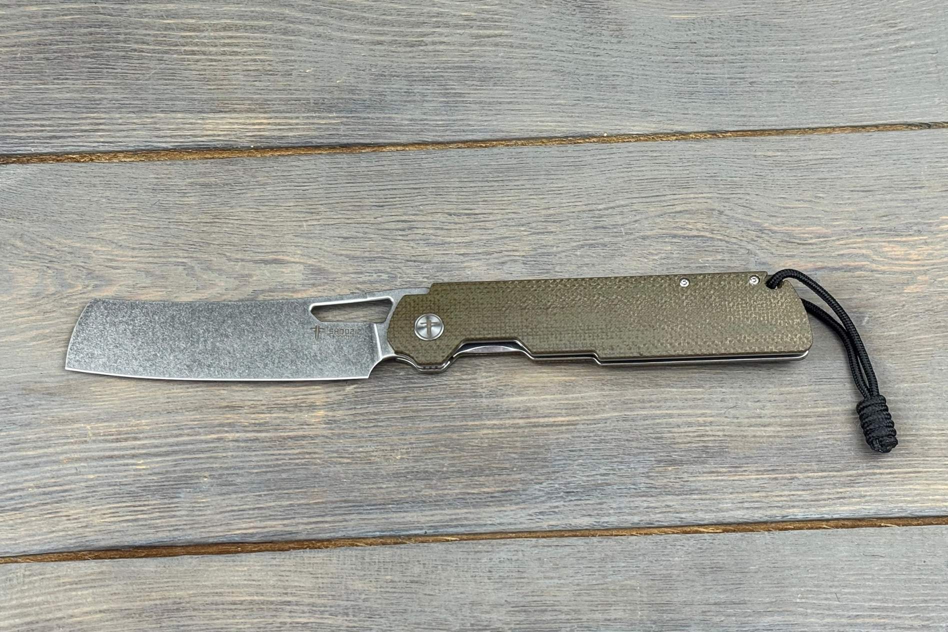 Руків’я виготовлено з зеленої мікарти — міцного та стійкого до зносу композитного матеріалу. Текстурована поверхня забезпечує надійний хват й комфорт навіть при тривалому використанні. Ергономічна форма руків’я робить управління ножем легким та зручним, а насичений зелений колір додає виробу індивідуальності.