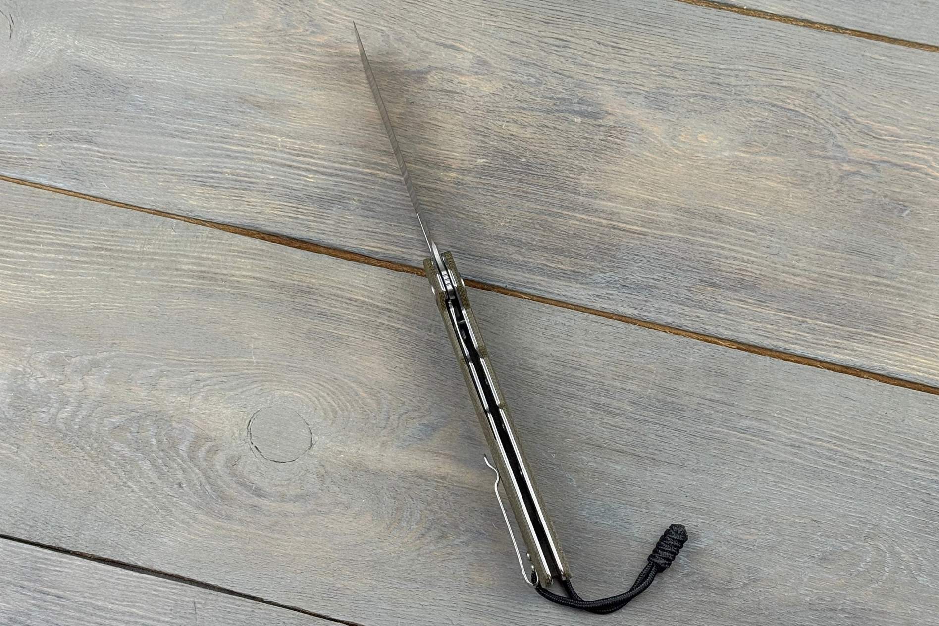 Лезо виконане зі сталі D2, відомої своєю міцністю, стійкістю до зносу та довготривалим утриманням гостроти. Обробка Stonewash надає клинку характерного матового вигляду, приховує подряпини та підкреслює технічний стиль ножа. Товщина 2,7 мм та ширина 31,19 мм забезпечують точне й контрольоване різання, а твердість 59–61 HRC гарантує довговічність заточування.
