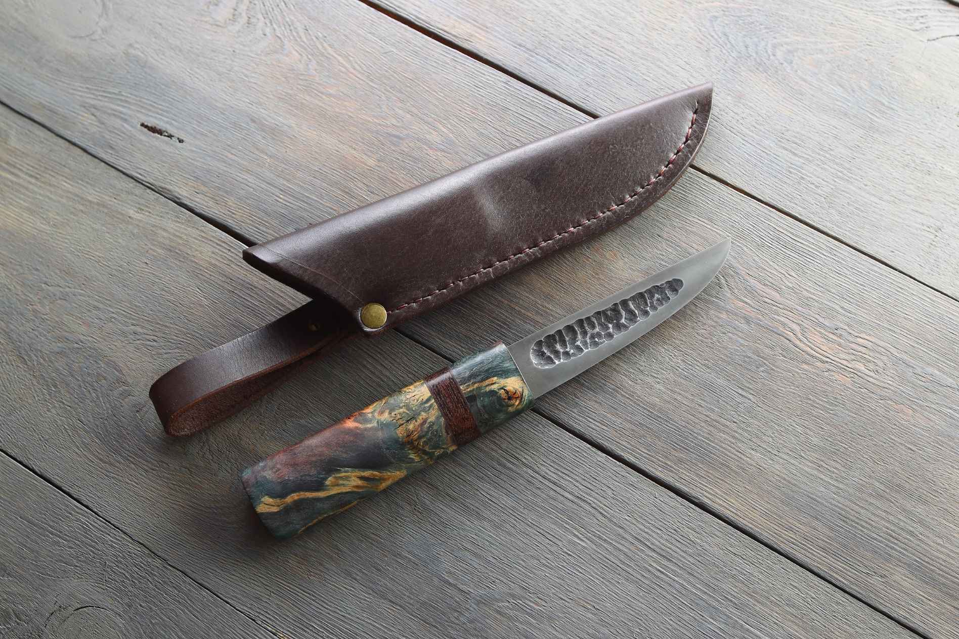Руків’я виконано зі стабілізованого сувелю клена, що забезпечує високу міцність і стійкість до вологи та температурних змін. Завдяки стабілізації, деревина зберігає свою форму та не піддається розтріскуванню.