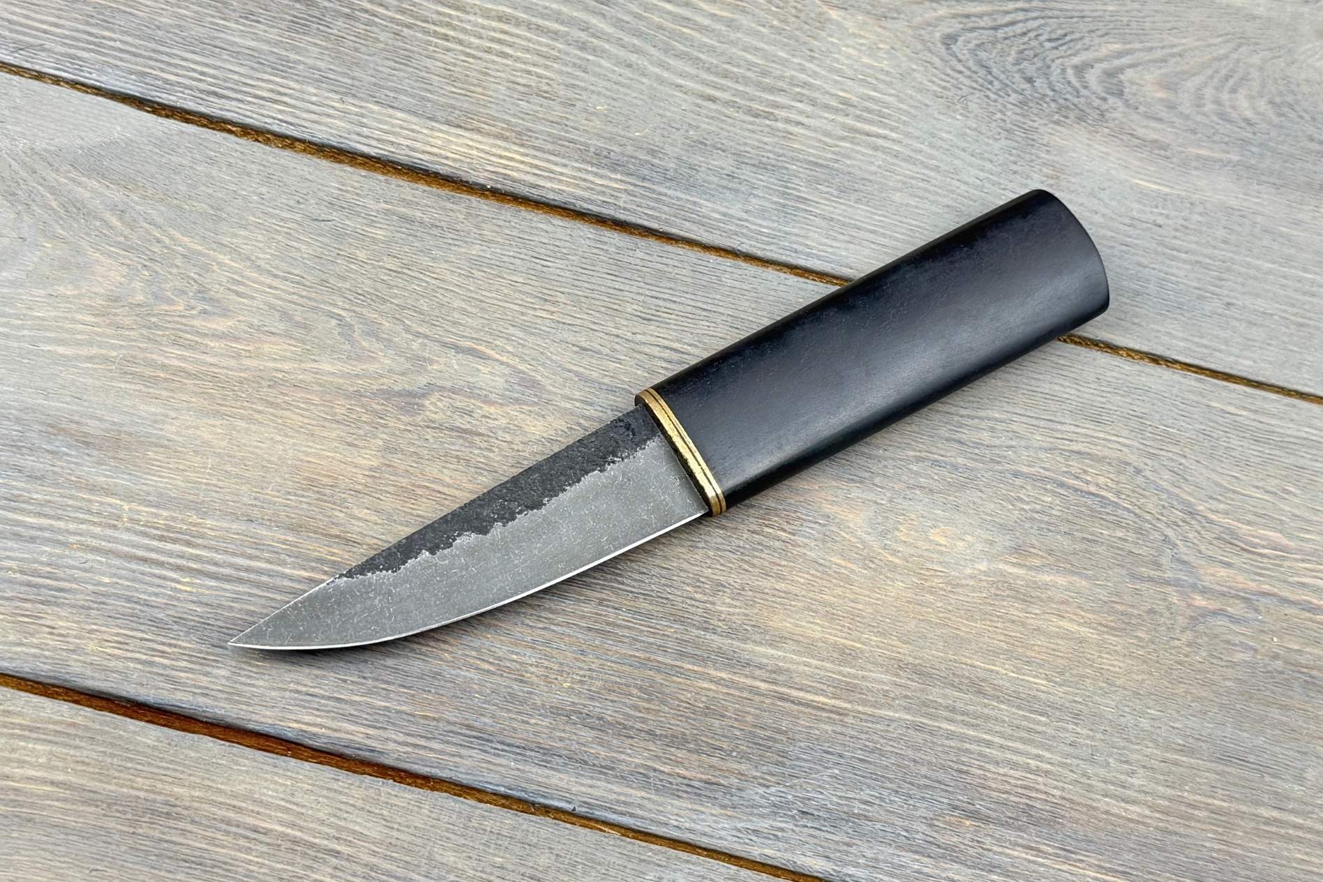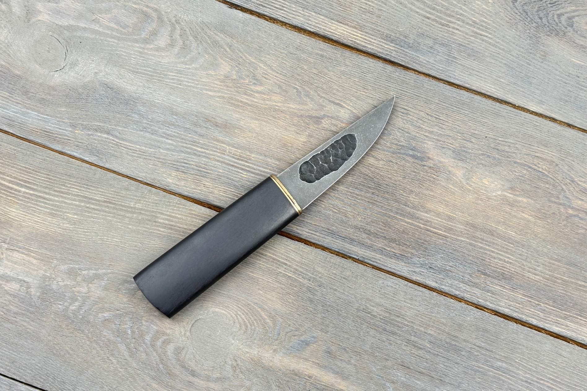 Руків’я виготовлене зі стабілізованої деревини з латунним больстером. Ця комбінація надає ножу візуальної гармонії та надійного балансу в руці. Текстура дерева приємна на дотик, а форма дозволяє працювати без втоми навіть тривалий час.